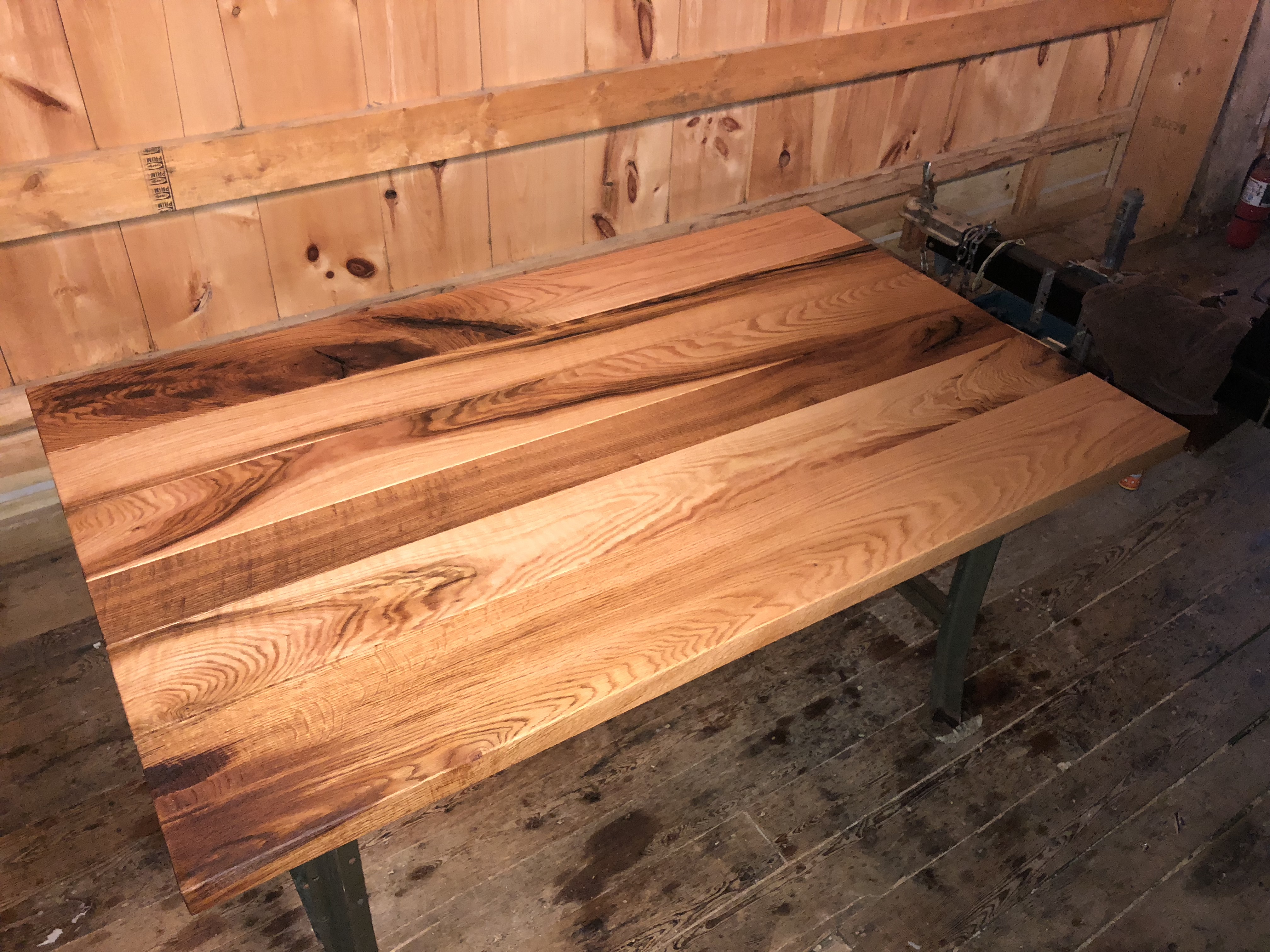 Was digging through the barn looking for a steel wagon wheel (which we never found) and we came across a pair of work bench legs. I have no idea where I got these from, but I had a matched pair. We needed a table for our cabin up north and I had a bunch of lumber that I had bought from a historical society so i through it would make for a fun day project. Started at around 10am and finished with the last of the finish just before midnight. Cutting the table legs down took me quite some time because they had them welded together and didn't want them to come apart. Total cost? About $50 for a gallon of Watco, some screws and a 1x so I could reinforce the center of the table. The wood was taken from a pile of lumber that I got a month ago. I figure there's about 3500 bdft in the pile and I only paid $500 for it. The wood is oak and the boards planed out to be 1-3/4" thick.
