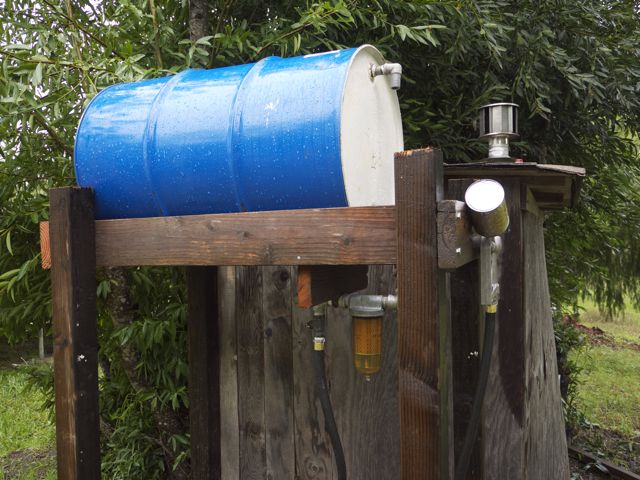 The $59 pump looks cheaply made and probably won't last. TSC sells a quality pump/nozzle/hose for about $250, currently on sale for $220. I chose instead to build a gravity fed fueling station with a $10 surplus 55 gallon drum. A second drum goes to town for refilling, and then is lifted with FEL attached forks on the tractor, high enough to gravity feed the drum on the stand. The nozzle, hose and fuel filter/water separator were all purchased at TSC for about $100. This set-up allows easy fueling of the tractor, RTV, and my truck. In the shed is a 10kw Kubota genset, which is currently powering everything on the ranch, as last night's severe windstorm created a widespread power outage. It could be some time before power is restored. 55 gallons will run the generator nonstop for over 4 days.