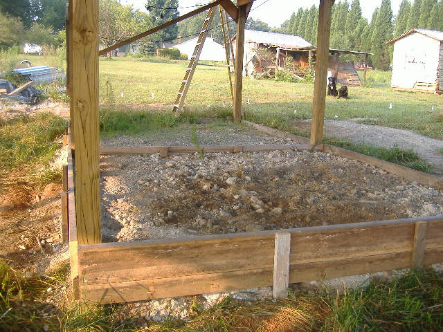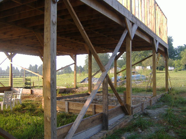 Only the tack room and wash stall will have concrete. The rest will be compacted clay. Each post is set 4ft deep with 2ft diameter of concrete.