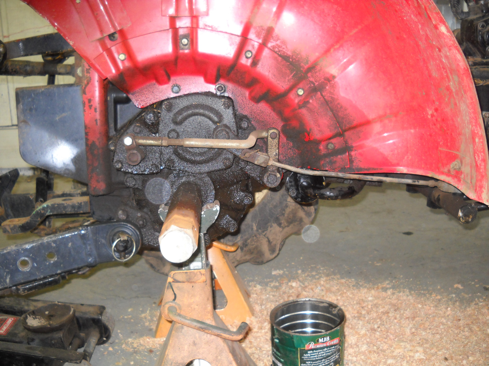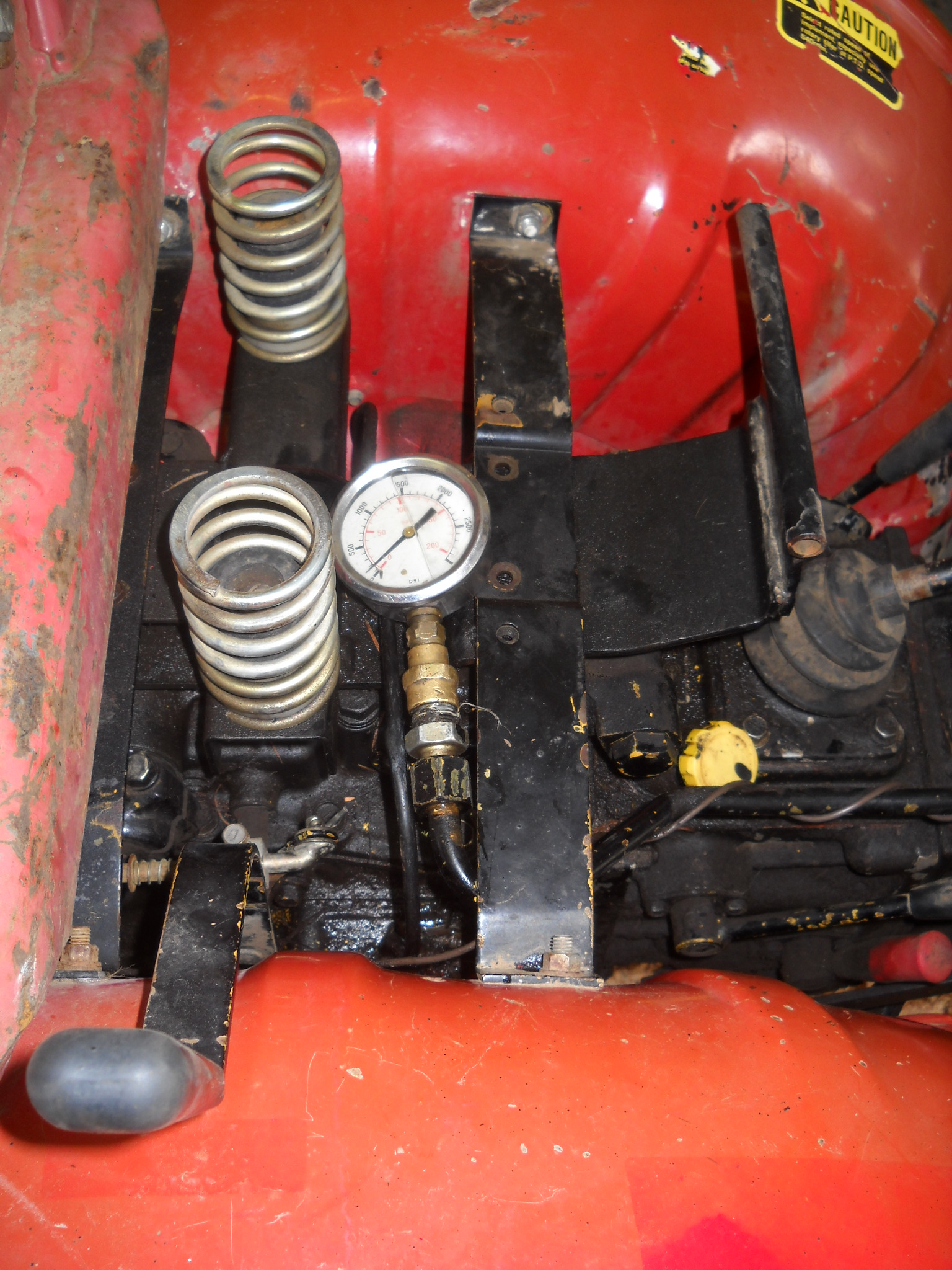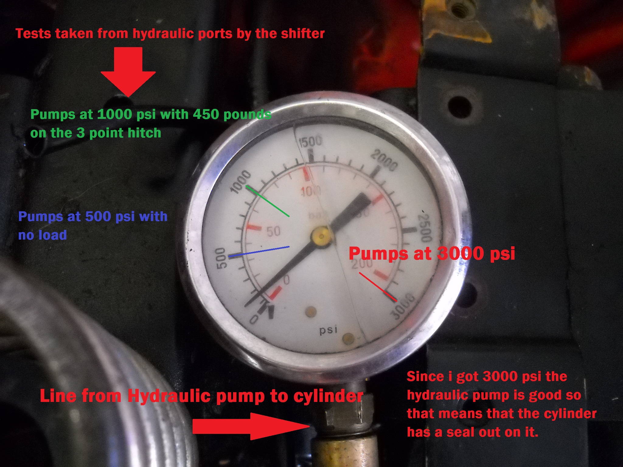 I just got back from the farm from working on my tractor. The first thing I did was I drained out the hydraulic oil which hadn't been changed in a while and then commenced to remove the hydraulic pump. Once I pulled off the pump I noticed that it is not a keyed pump, it has a long bolt on the end and turns with the engine. So i put it all back together. By then, all the hydro oil had been drained so I pulled the rear wheel off and got out the hydraulic filter. It has residue from gasket maker on it and it did have some metal shavings. Part of those shavings are from the hydraulic dip stick but the rest i don't know. :(:confused2: So i washed the filter in a coffee can of Diesel and used the air compressor and blew it clean. Then I reinstalled it and put in the new hydraulic fluid to test the hydraulic pressure i was getting. We first hooked up the gauge to the hydraulic port under my shift lever and found that there is 0 psi with the 3 point in float and 500 psi under no load. We got it to 1000 psi with 450 pounds on it but it would not lift the weight. Then we hooked the gauge to the line that feeds into the cylinder and got 3000 psi so that means the pump is good. :) That also means I have a seal out in the cylinder so now I have a general idea where to start really taking stuff apart. :eek: