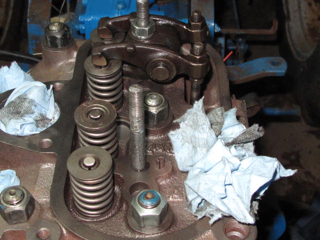 More of the story...I used 2 nuts locked against each other to install the studs. Note the location of the short one. Second shot is the head gasket in place. Some of the coolant passages have a black rubber outline to seal, some don't.. The 3rd shot is the spacer that goes on the short stud down in the intake passage. 4th is the head torqued down and last is the rocker arms installed and clerance set for .012. That is all for tonight. Tomorrow is a holiday so I will have more time to work on the tractor.