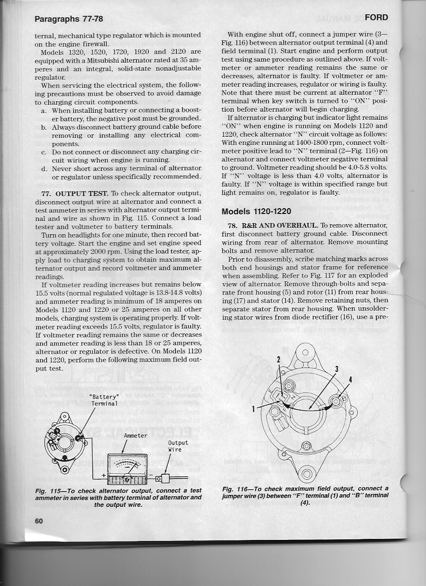 Jan 13, 2016 / 1920 Alternator not charging based on instrument gauge #11 kirkawilson Platinum Member Joined Jun 19, 2011 Messages 549 Location Simpsonville, SC Tractor New Holland 1920 4WD & Cub Cadet (IH) Model 108 Here is the alternator output test instructions from my IT manual (FO 46), it the image attached.