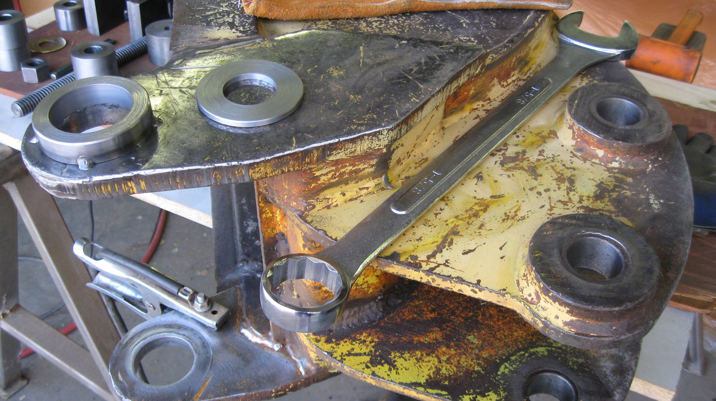 This is one of the many alignment bushings and devices I had to make to align bosses and bushings. I used 1" acme threaded rod stock to make the bushing puller-pusher. Regular all-thread was not nearly as manageable as the acme thread. It seemed to me that the amount of effort needed to turn the acme nut for pulling or pushing my bushings was about 1/3 that required to turn a 1" all-thread nut.