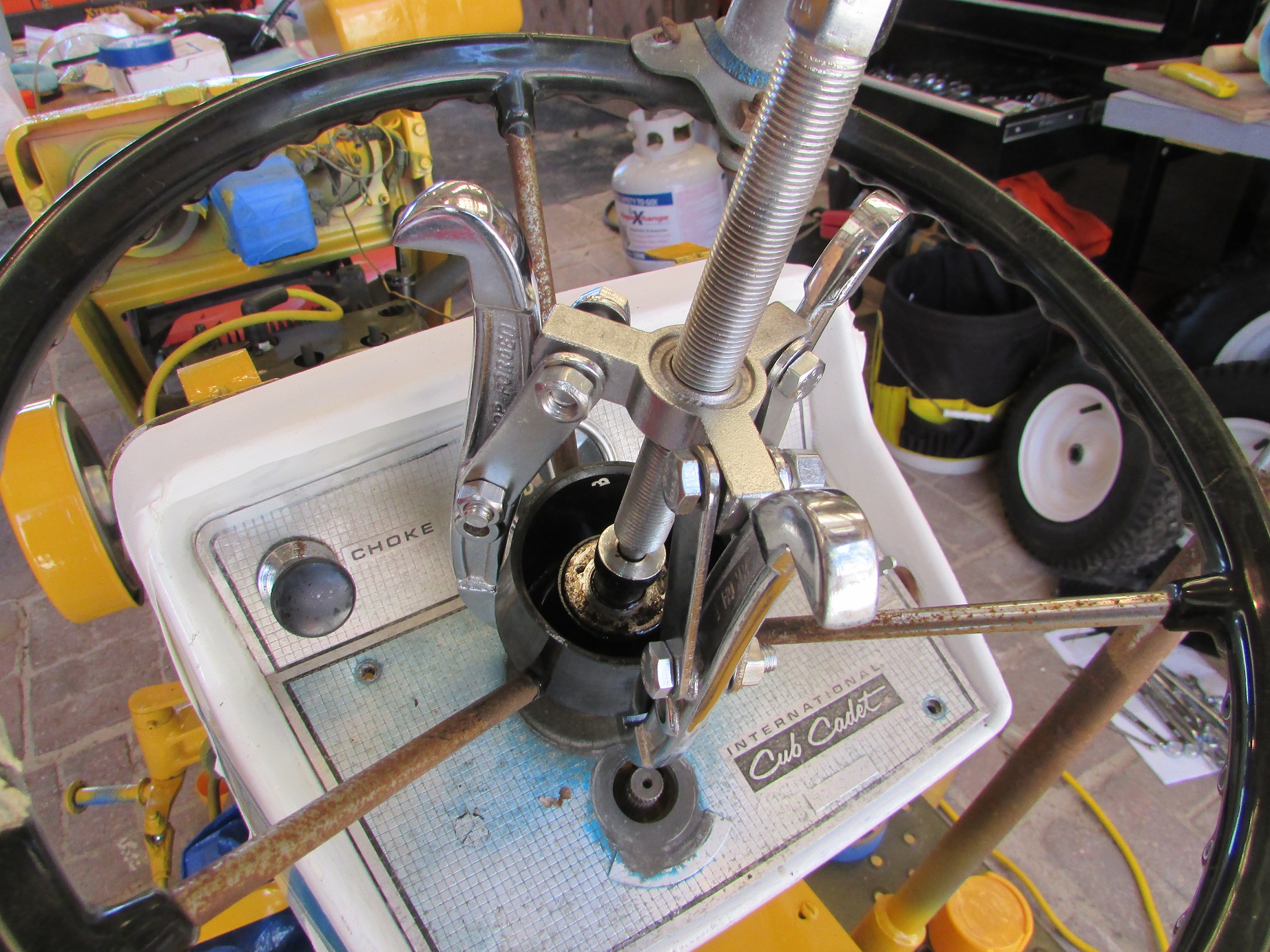 Now down at the Kubota/Cub Cadet dealer who will do their best to get that steering wheel off without ruining the steering column. Once that is off, I can then fix the dash and for sure get a new more comfortable steering wheel This one is utterly wrecked, so no going back, but the rim is very thin. That might be an area I modernize a bit though going to try to find something basic that doesn't yell brand new and not original when installed. When I did my Gravely, I made sure it was perfect. Didn't go to that length here; frankly the last guy, or the guy before, had made a mess of the paint and hood already.