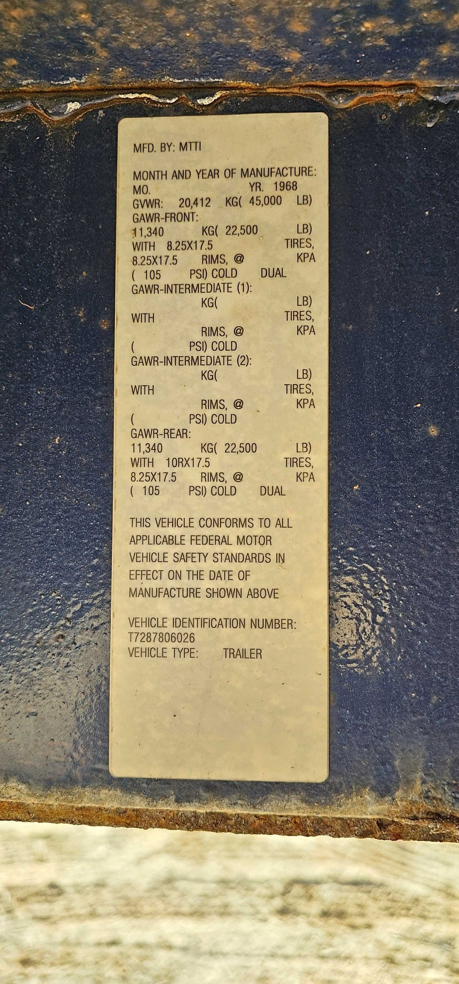 1968 MTTI LOWBOY TRAILER 8' WIDE 49' LONG GVWR: 45,000 LBS GAWR: 22,500 LBS