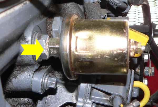 See the little yellow arrow? It's pointing at my oil leak -- basically between those two nuts. The one on the engine (right) side seems fine, it's the join between that one and the brass nut on the left side that's weeping...