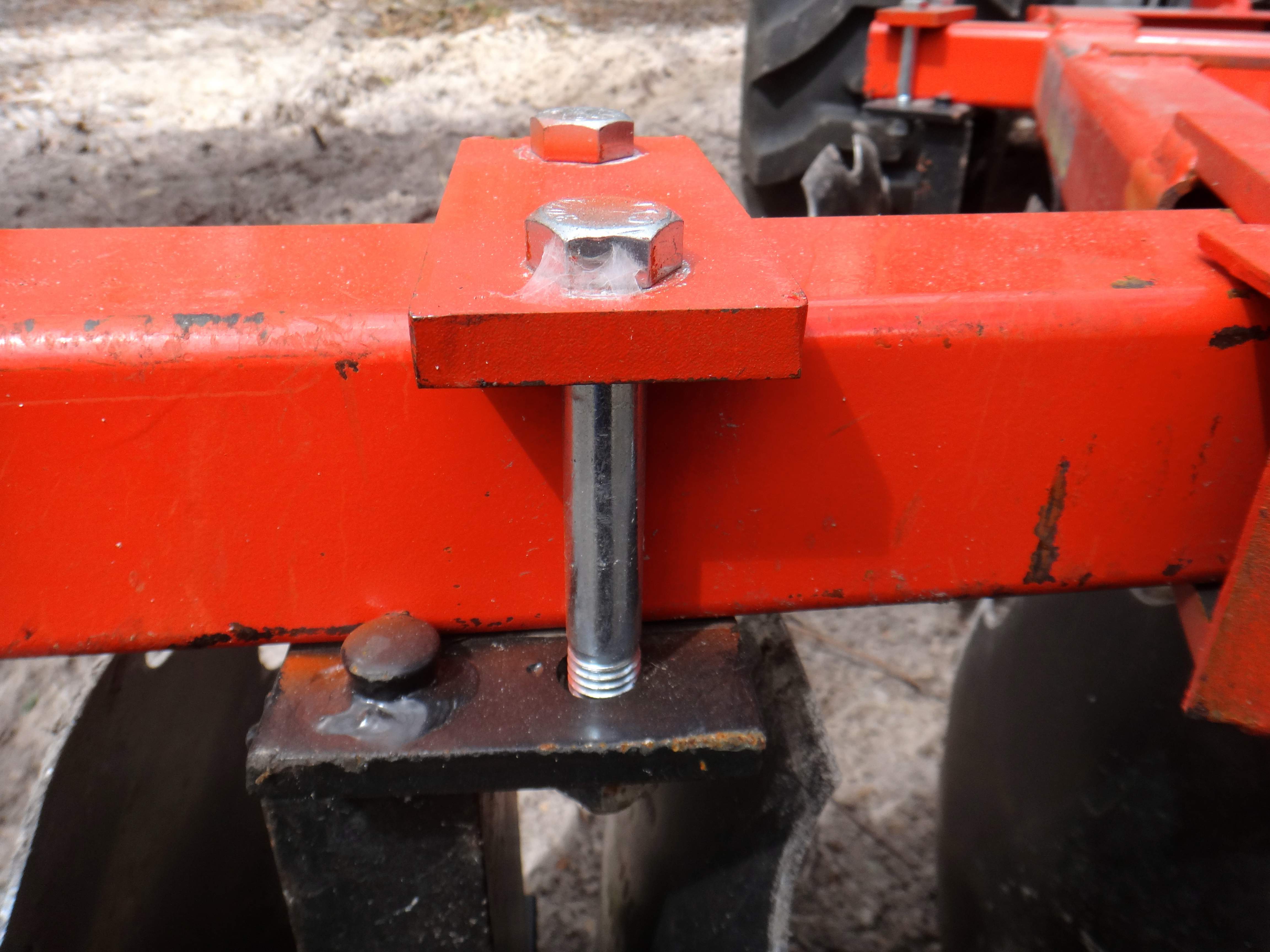 The lever adjust on pictured Disc Harrow is good because adjustment holes are in the lever, a non-structural part, rather than in the frame, which is the norm for clamp plate adjustment of Disc Harrows.