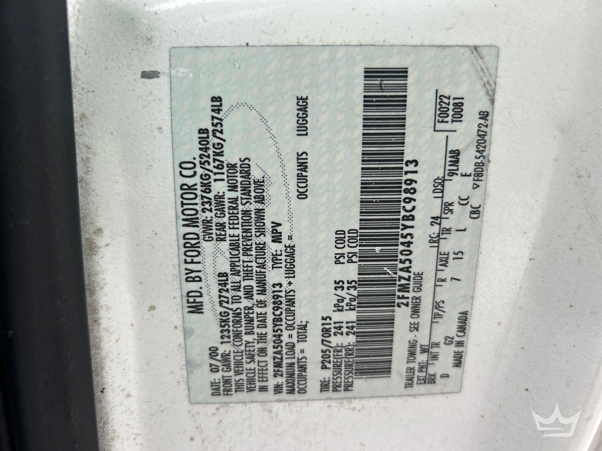Location: Tampa, FL (Orange County Sheriff) VIN: 2FMZA5045YBC98913 Odom reads 103,176 miles. Pwd. by 3.8L V6 gas engine, automatic transmission. Equipped with 3rd row seating, steering wheel cruise and dash controls, am/fm stereo, heat and a/c, 12v charger. Runs and drives. Limited function check completed at check in. Title branded police.