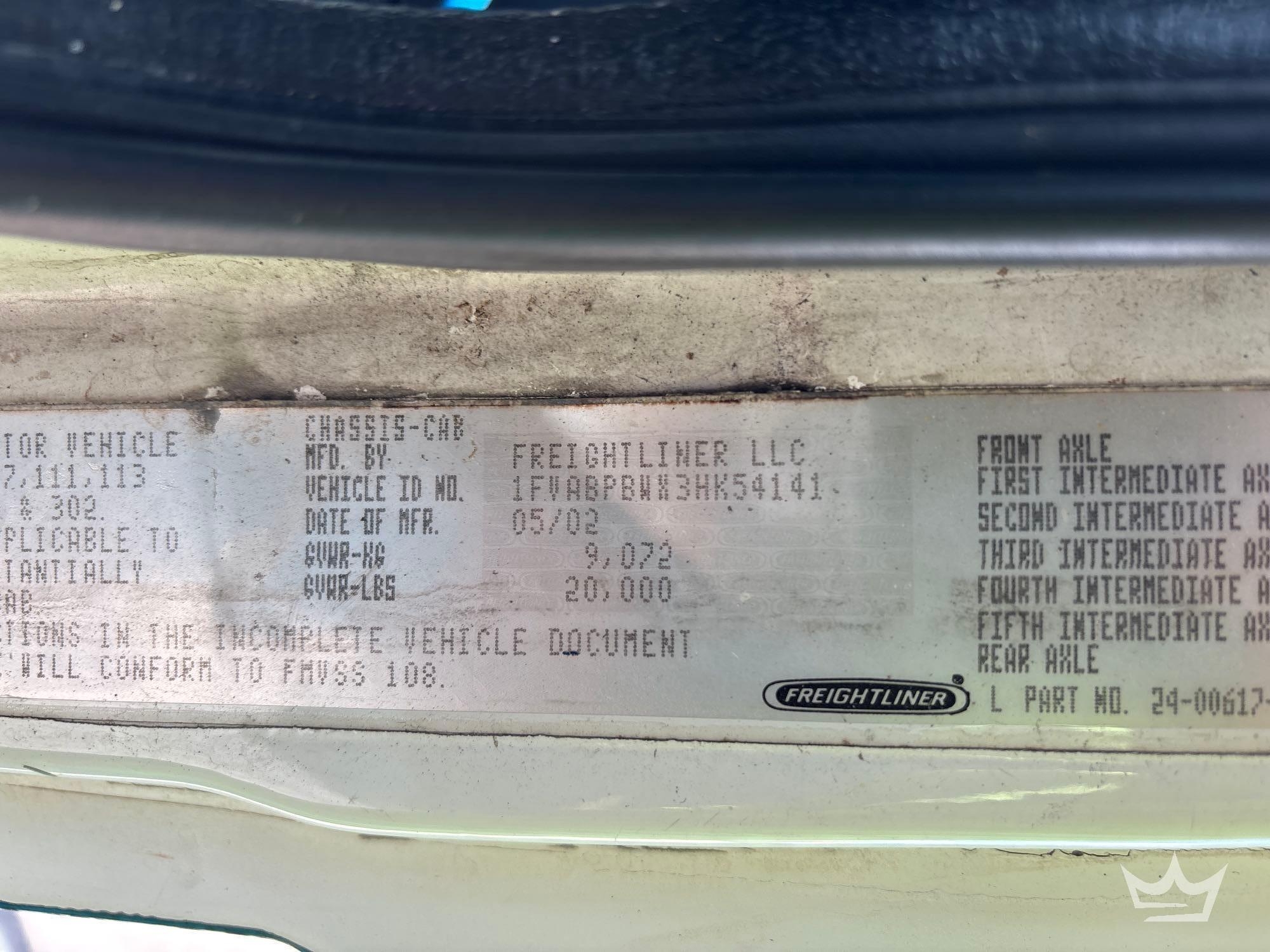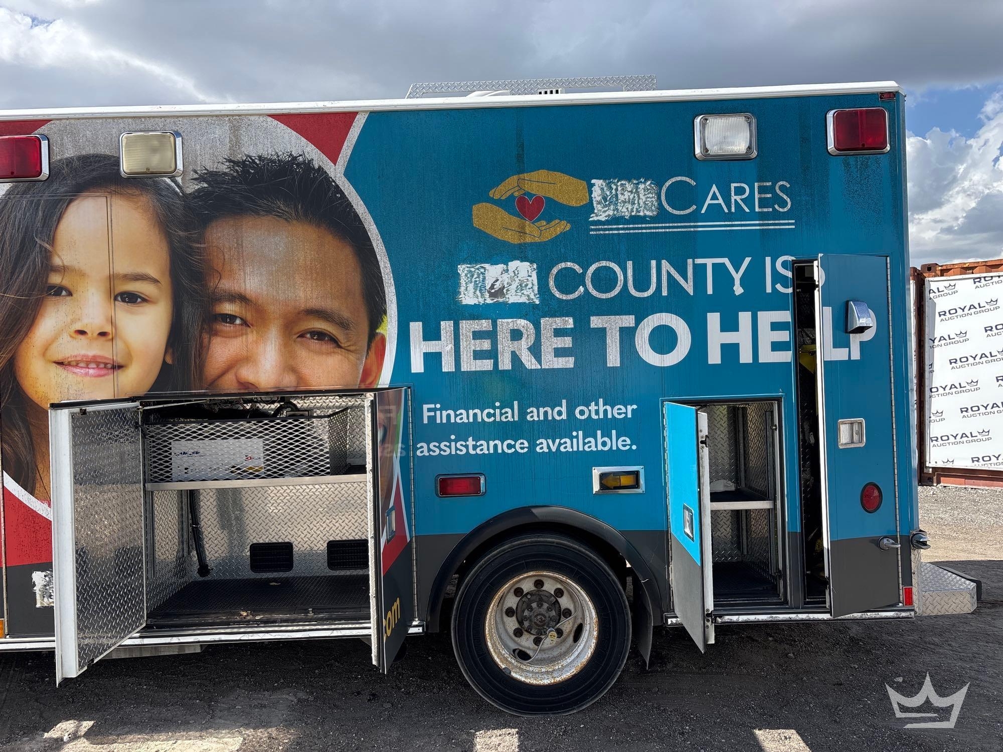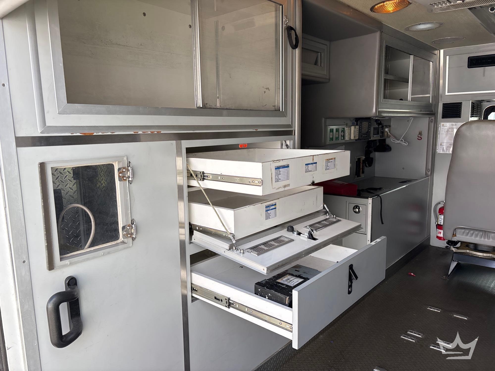 Location Fort Myers, FL (Lee County Fleet Management); VIN:1FVABPBWX3HK54141 Odom Reads 414,285 miles, pwd by 5.9L 6-cylinder diesel engine, Allison automatic transmission. Equipped with: ambulance body package, paramedic and passenger seating, oxygen delivery outlet, Engel portable fridge, Vanner IQ2600 Power Inverter, internal and external storage compartments, emergency lights and sirens, 4x2 drive line, GVWR 20,000 lbs, front GAWR 8,000 lbs, and rear GAWR 12,000 lbs, Whelen traffic advisor system, pwr windows, mirrors and locks, Weldon display screen, AC/heat. Runs and drives. Limited function check completed during check in.