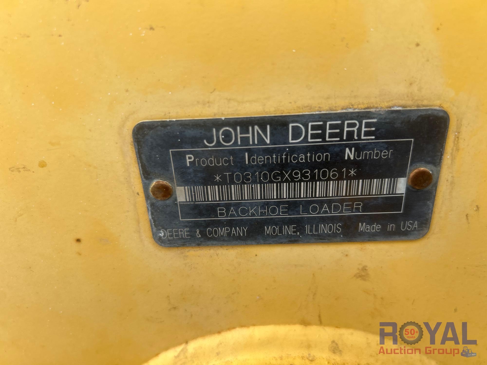 PIN: T0310GX931061 Hours Read: 1,621 hrs, pwd by John Deere 4045 4.5L 4-cylinder diesel engine, 4-speed collar shift transmission. Equipped with: 1.3 CuYd front loader bucket w/ bolt-on cutting edge, four wheel drive 4WD, hydraulic dipper w/ bucket, two rear hydraulic stabilizers, 4-post ROPS, joystick controls. Runs, drives and operates. Limited function check completed during check in.