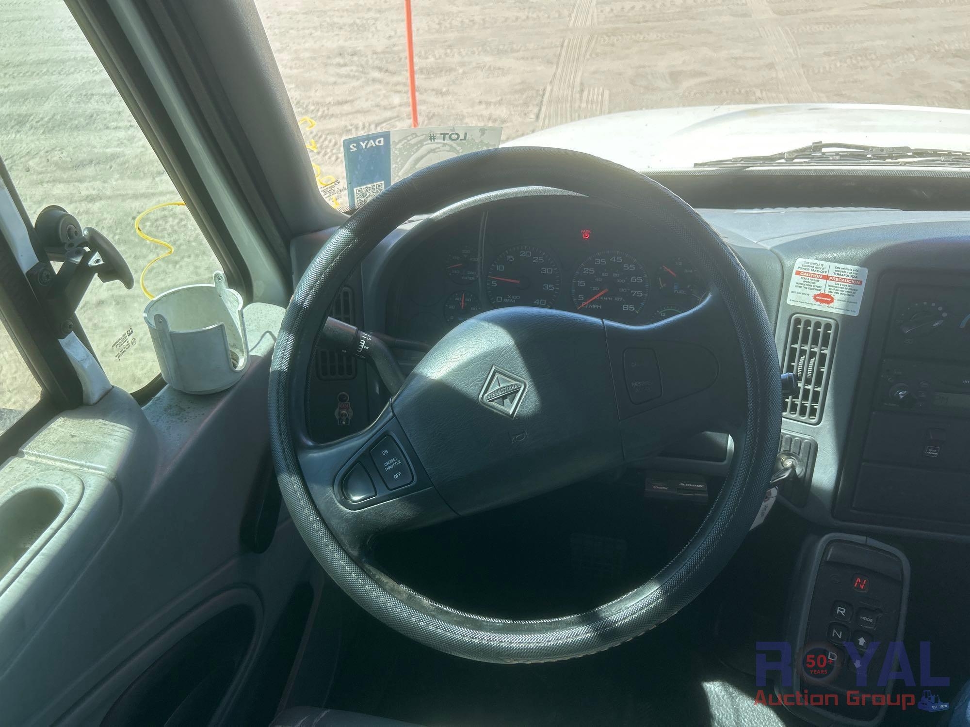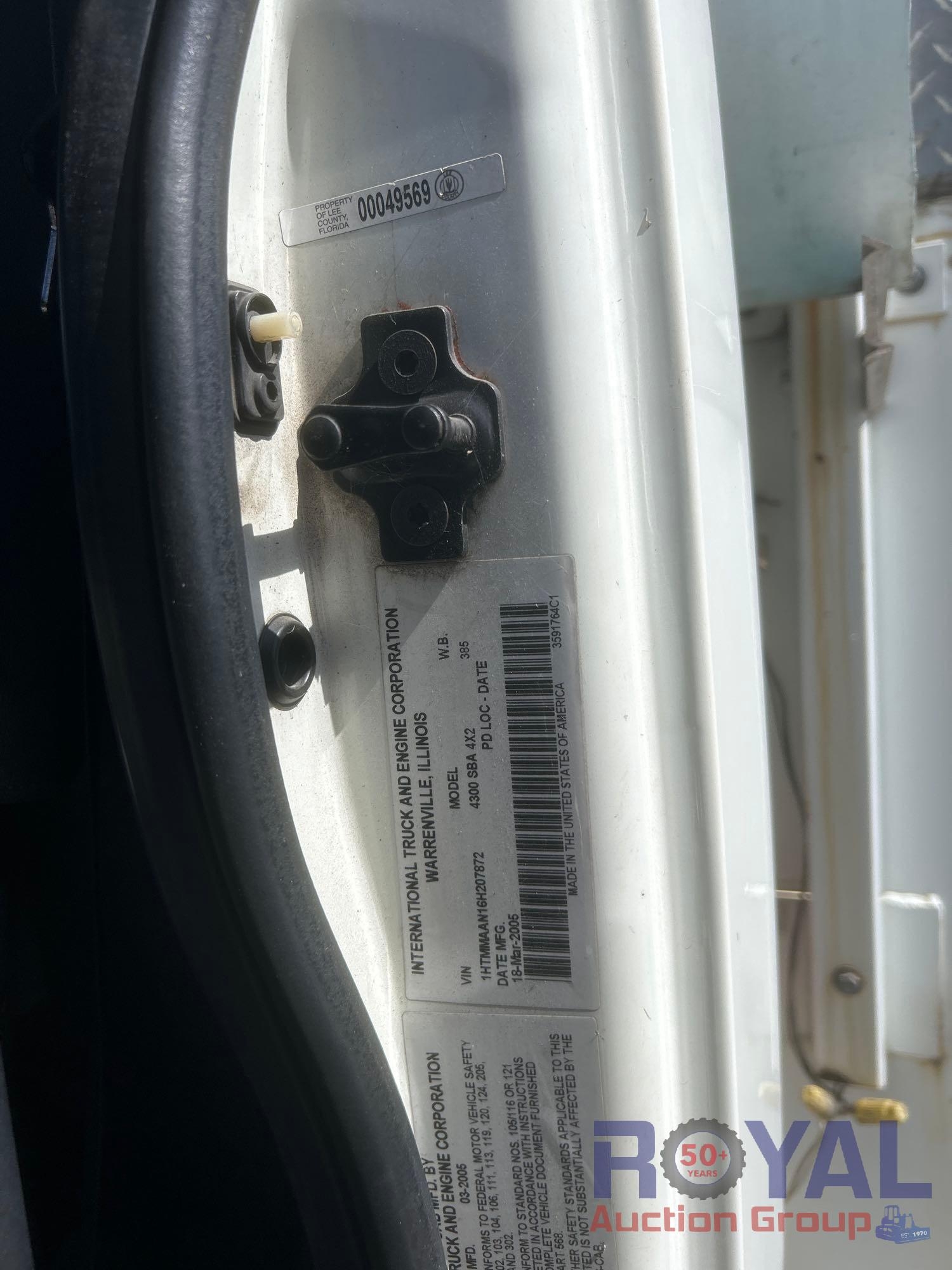 Lee County Fleet Management; VIN:1HTMMAAN16H207872 Odom Reads 171,665 miles, pwd by Navistar DT466 7.6L 6-cylinder diesel engine, Allison automatic transmission. Equipped with: Altec TA50 bucket boom w/ material handling, lever boom controls, 50ft platform height, 600lb max capacity, service body w/ cargo compartments, two mid hydraulic stabilizers , power inverter, tow hook, dual rear wheels, GVWR more info coming soon, air brakes, trailer air supply, am/fm stereo, AC/heat. Runs and drives. Limited function check completed during check in.