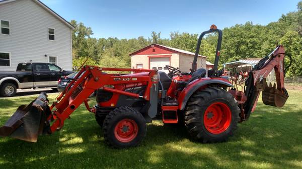 KIOTI DK45S TRACTOR WITH WOODS BH90X FRAME MOUNTED BACKHOE, 45HP DIESEL 3PT AND PTO, 895 HRS.