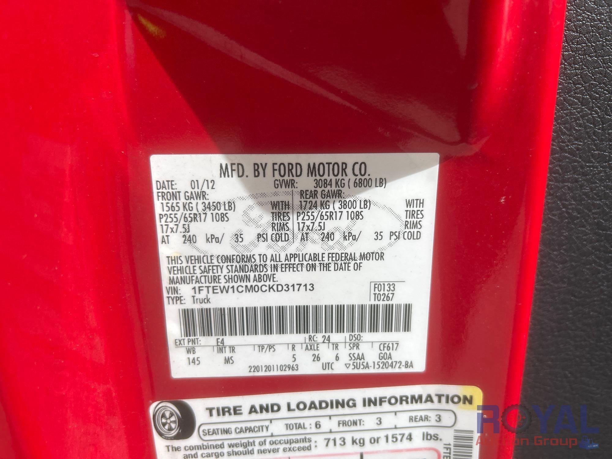 City of Pompano Beach; VIN: 1FTEW1CM0CKD31713 Odom Reads 86,919 miles, pwd by 3.7L V6 gas engine, automatic transmission. Equipped with: tow package, bed liner, bed cover, pwr windows, mirrors and locks, steering wheel cruise, am/fm/c stereo, hands free phone system, AC/heat. Runs and drives. Limited function check completed during check in.