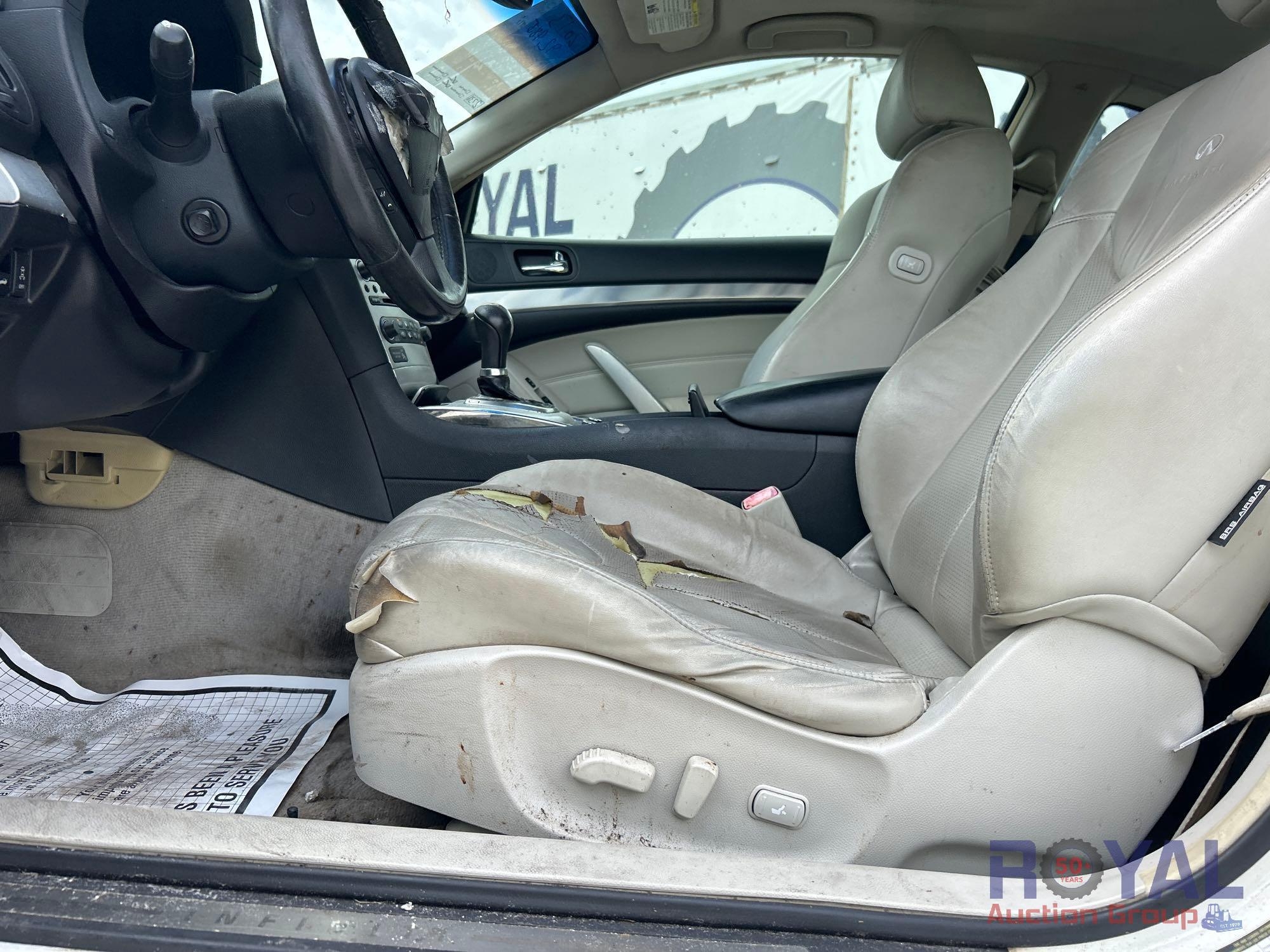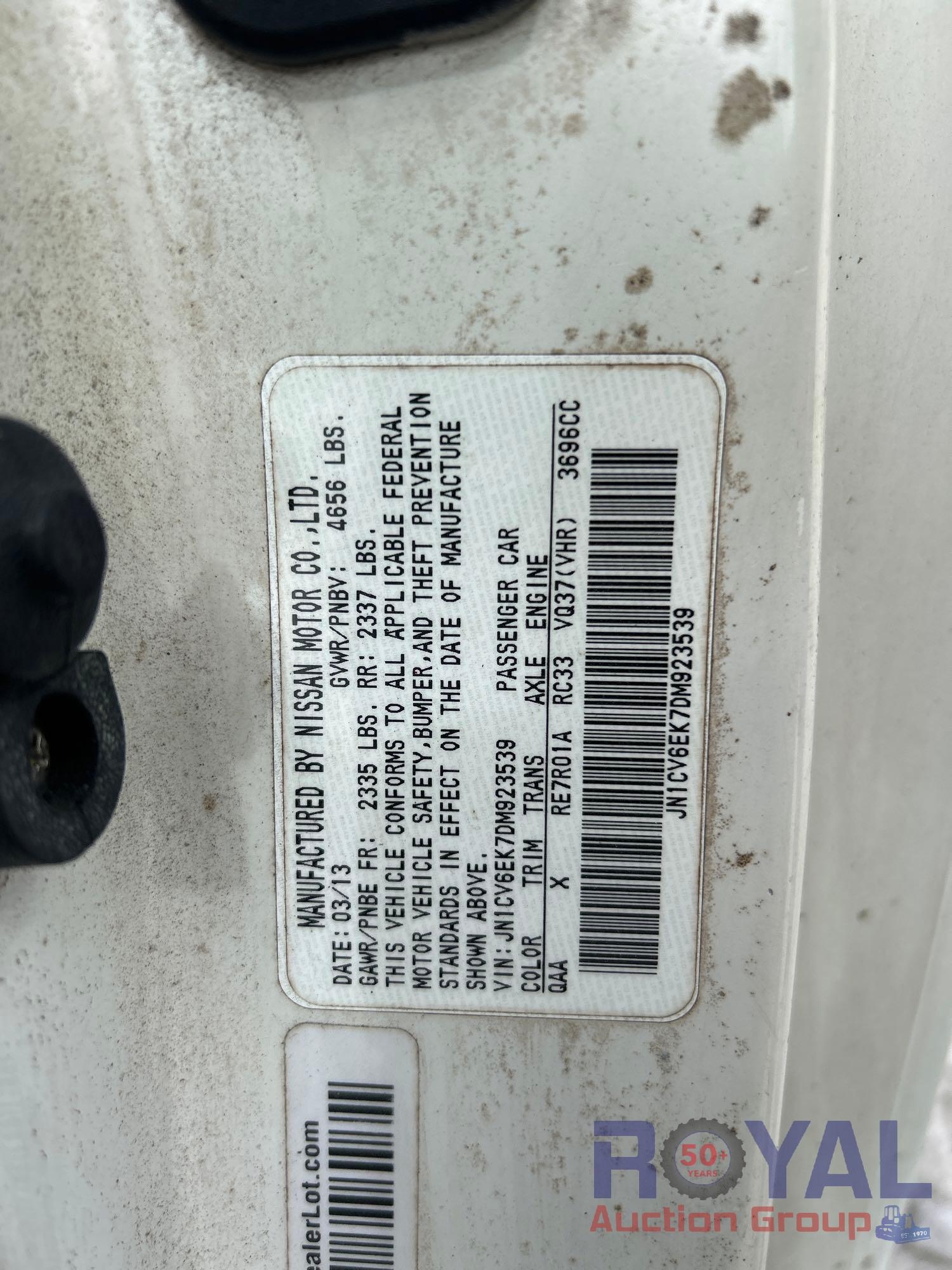 Year: 2013 Make: Infiniti Model: G37 Vehicle Type: Passenger Car Mileage: Plate: Body Type: 2 Door Coupe Trim Level: Base; Sport; Journey Drive Line: RWD Engine Type: V6, 3.7L Fuel Type: Gasoline Horsepower: Transmission: VIN #: Jn1cv6ek7dm923539 Features and Notes:
