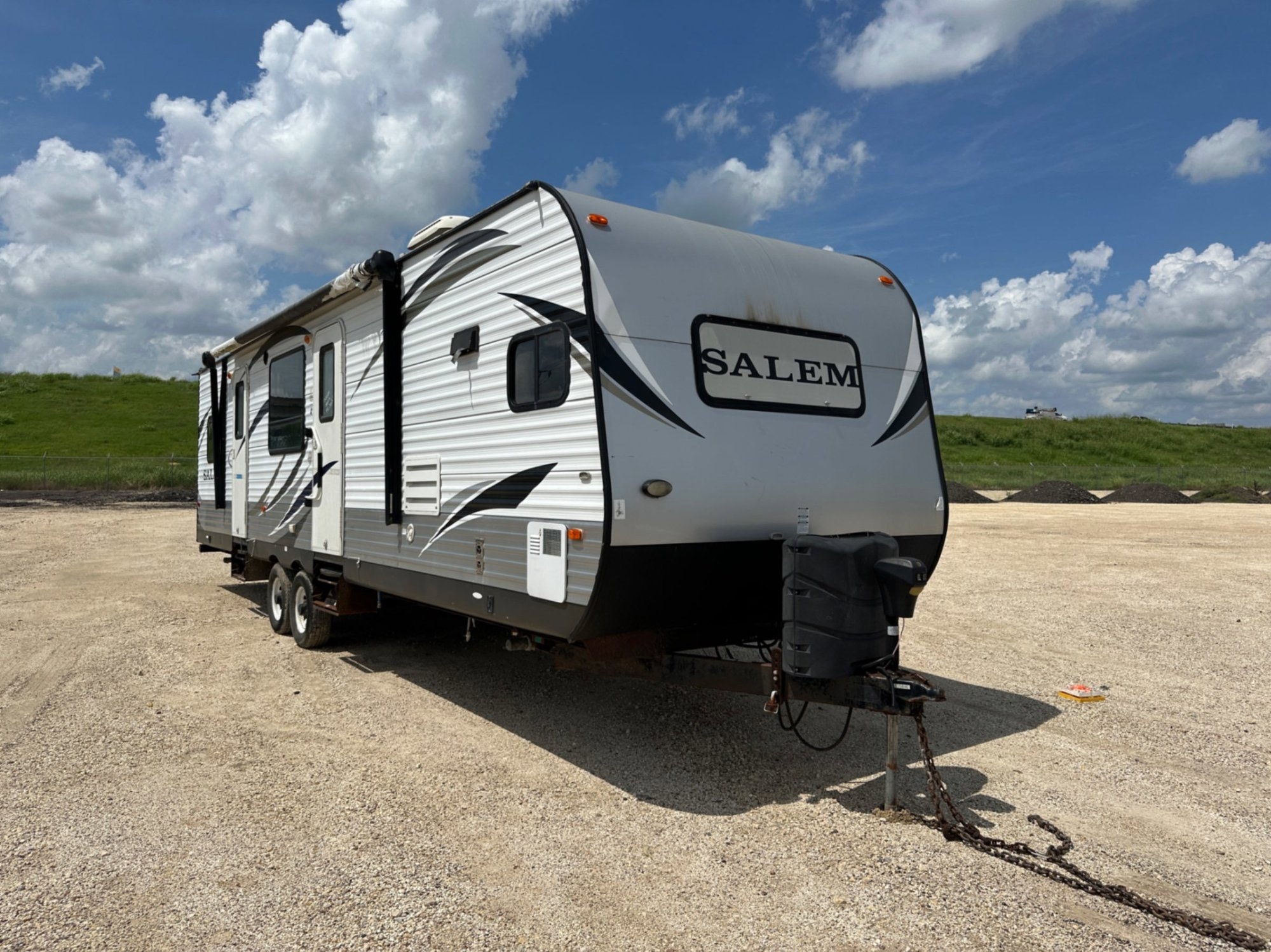(Cleburne. TX) 2014 FORREST RIVER SALEM TRAVEL TRAILER VIN/SN: ~ 4X4T SME25FA312434, GVWR:~ 7,600, SUSPENSION:LEAF SPRING, 30 FT LENGTH, SLIDE-OUT, MANUAL AWNING, ROOF A/C, PROPANE FURNACE, FULL KITCHEN W/ STOVE & FRIDGE, FULL BATH, SLEEPS 6-8, FRONT QUEEN BED, REAR BUNKS, DINETTE CONVERSION, FRESH/WASTE WATER TANKS, 30 AMP SERVICE, PASS-THROUGH STORAGE. CONDITION UKNOWN ITEM# 17157