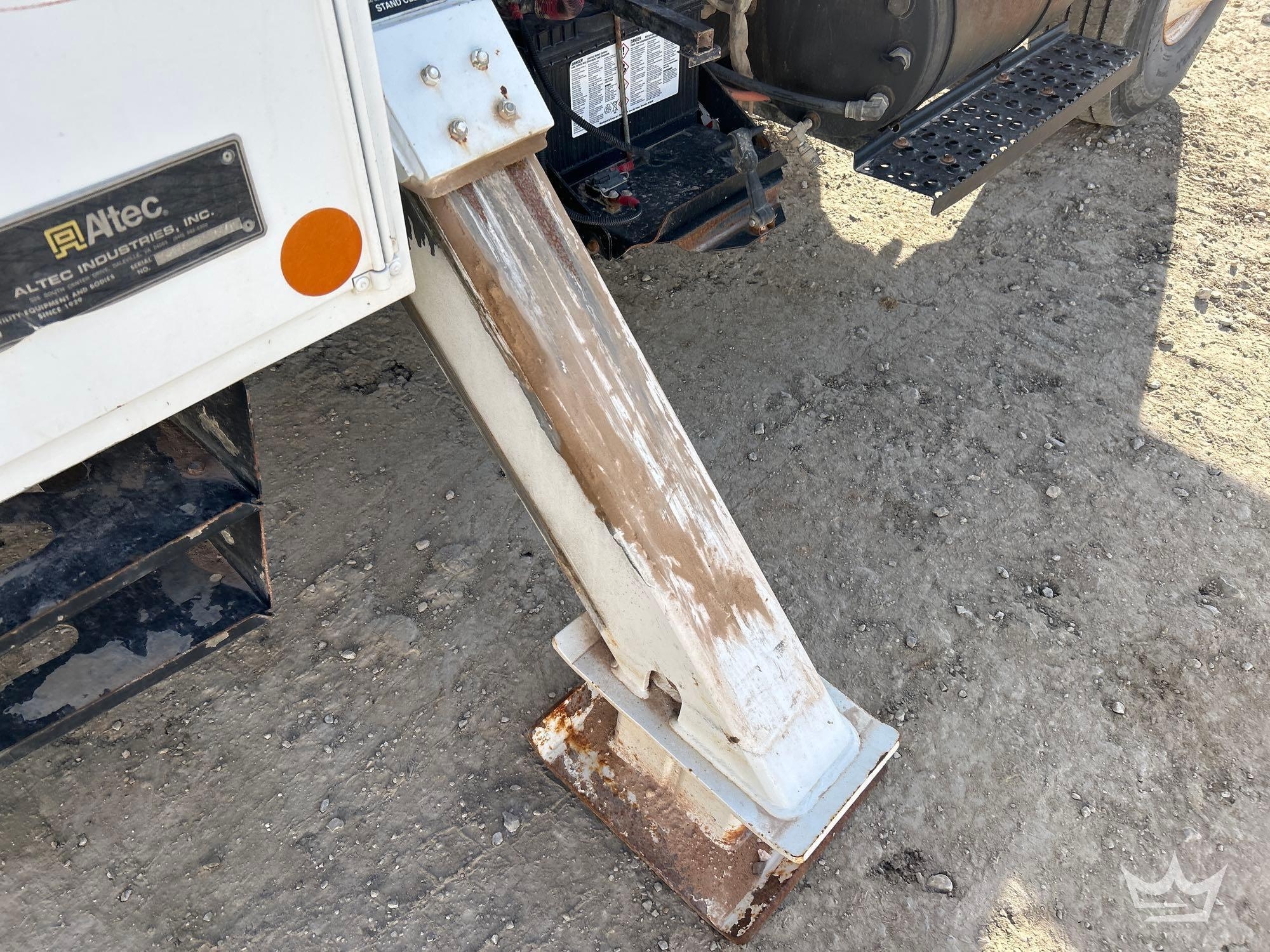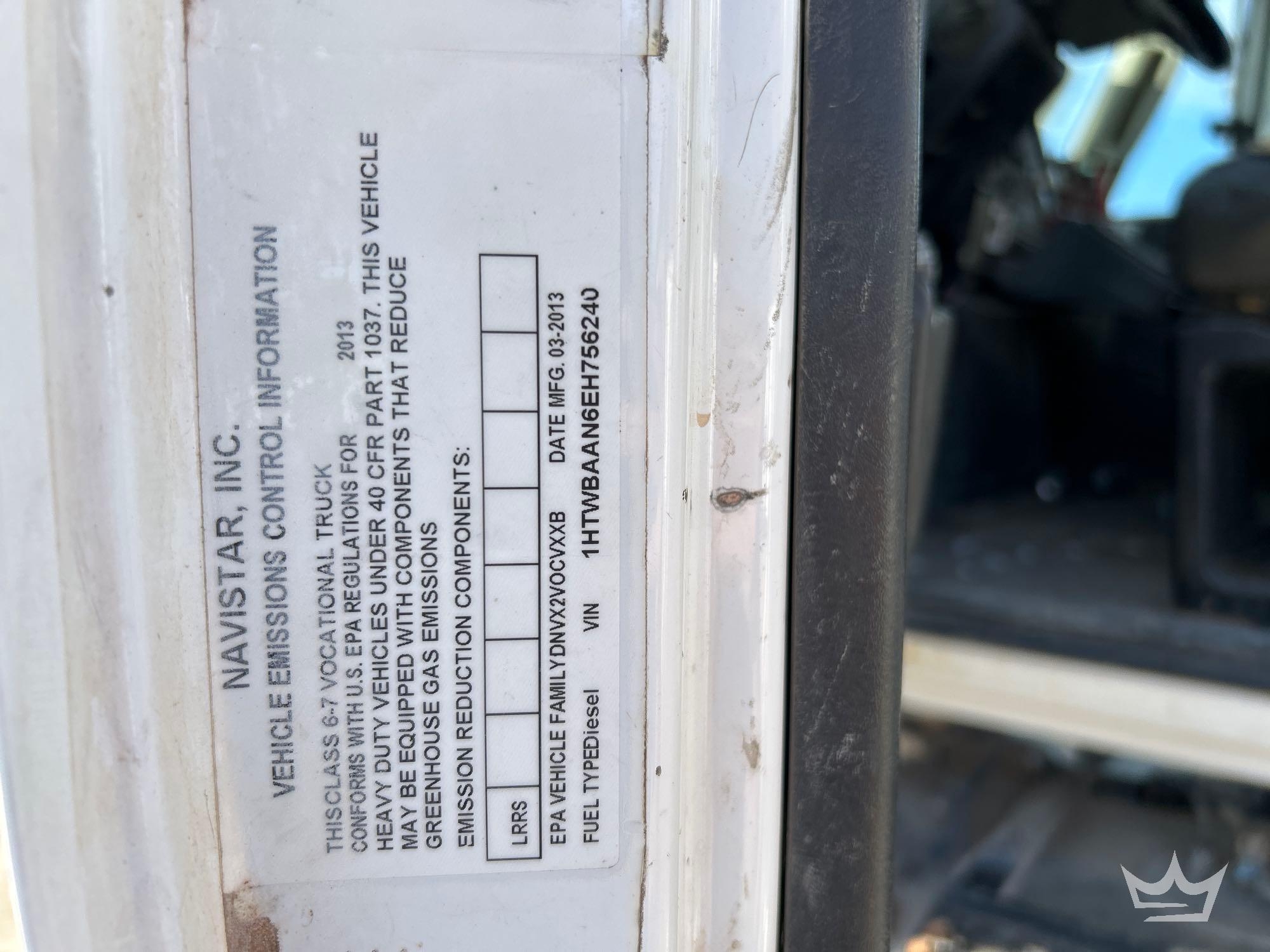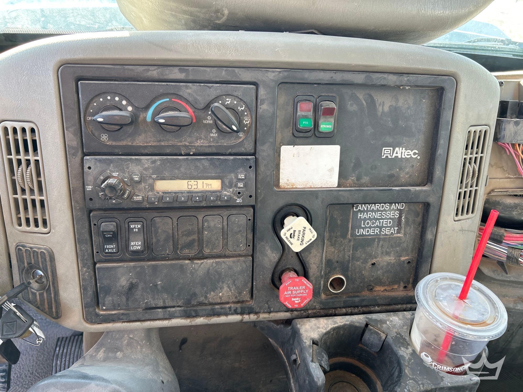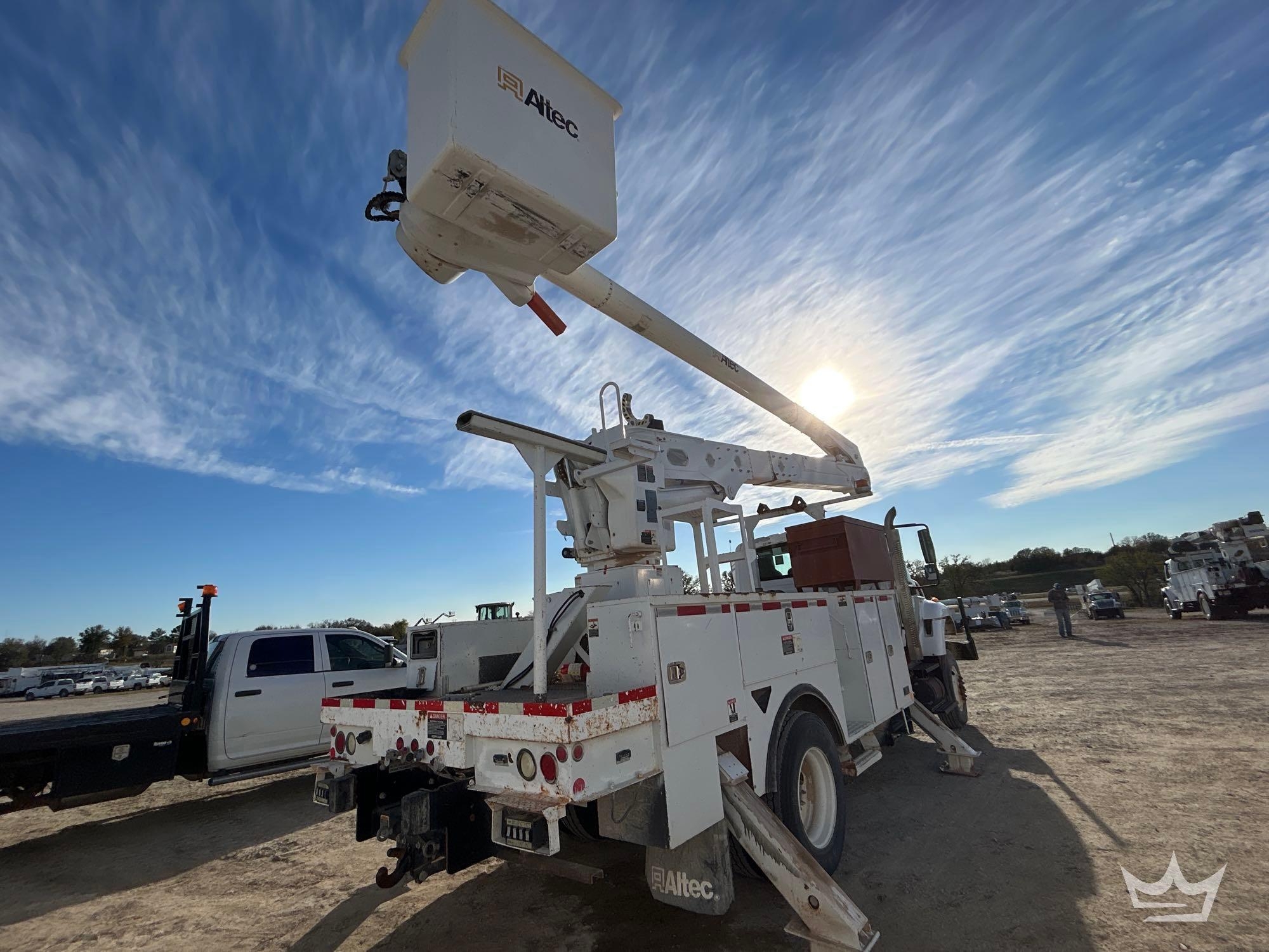 Location: Royal Auction Group, Dallas Ft. Worth, TX. VIN: 1HTWBAAN6EH756240 Odom Reads 66,052 miles, pwd by International 7.6L 6-cylinder diesel engine, Allison automatic transmission. Equipped with: Altec A55F material handling bucket boom, 55ft platform height, 700lb capacity, service body w/ cargo compartments, four wheel drive 4WD, mid and rear hydraulic stabilizers, dual rear wheels, air brakes, trailer air supply, PTO, steering wheel cruise, am/fm stereo, AC/heat. Runs, drives and operates. Limited function check completed during check in.