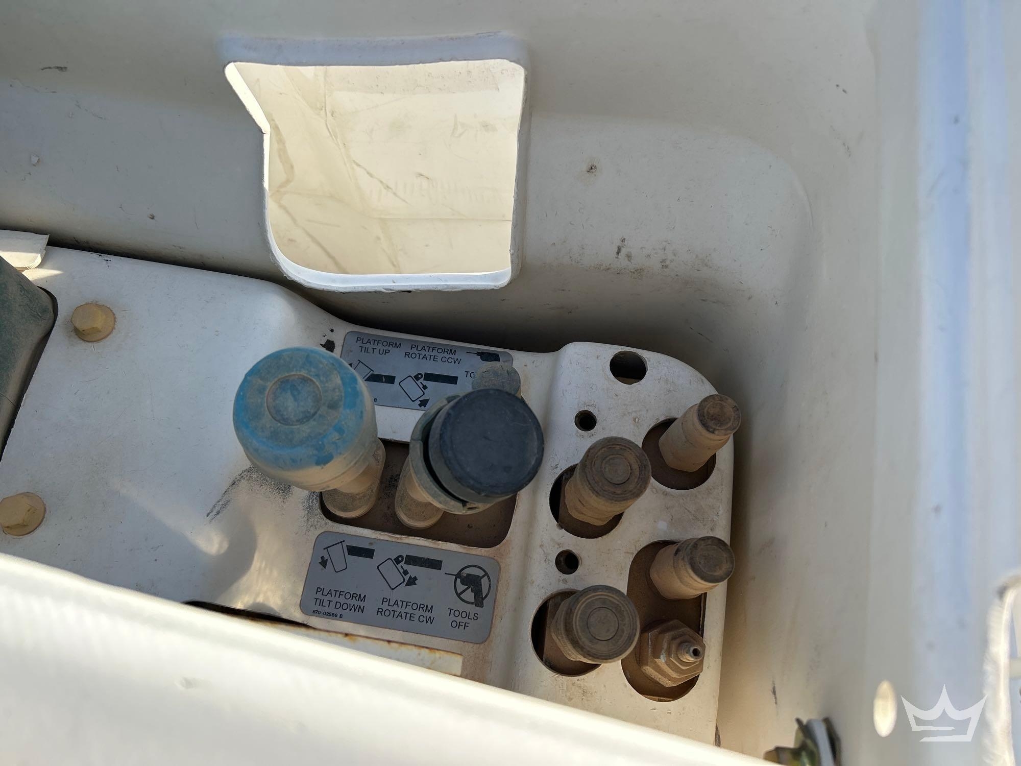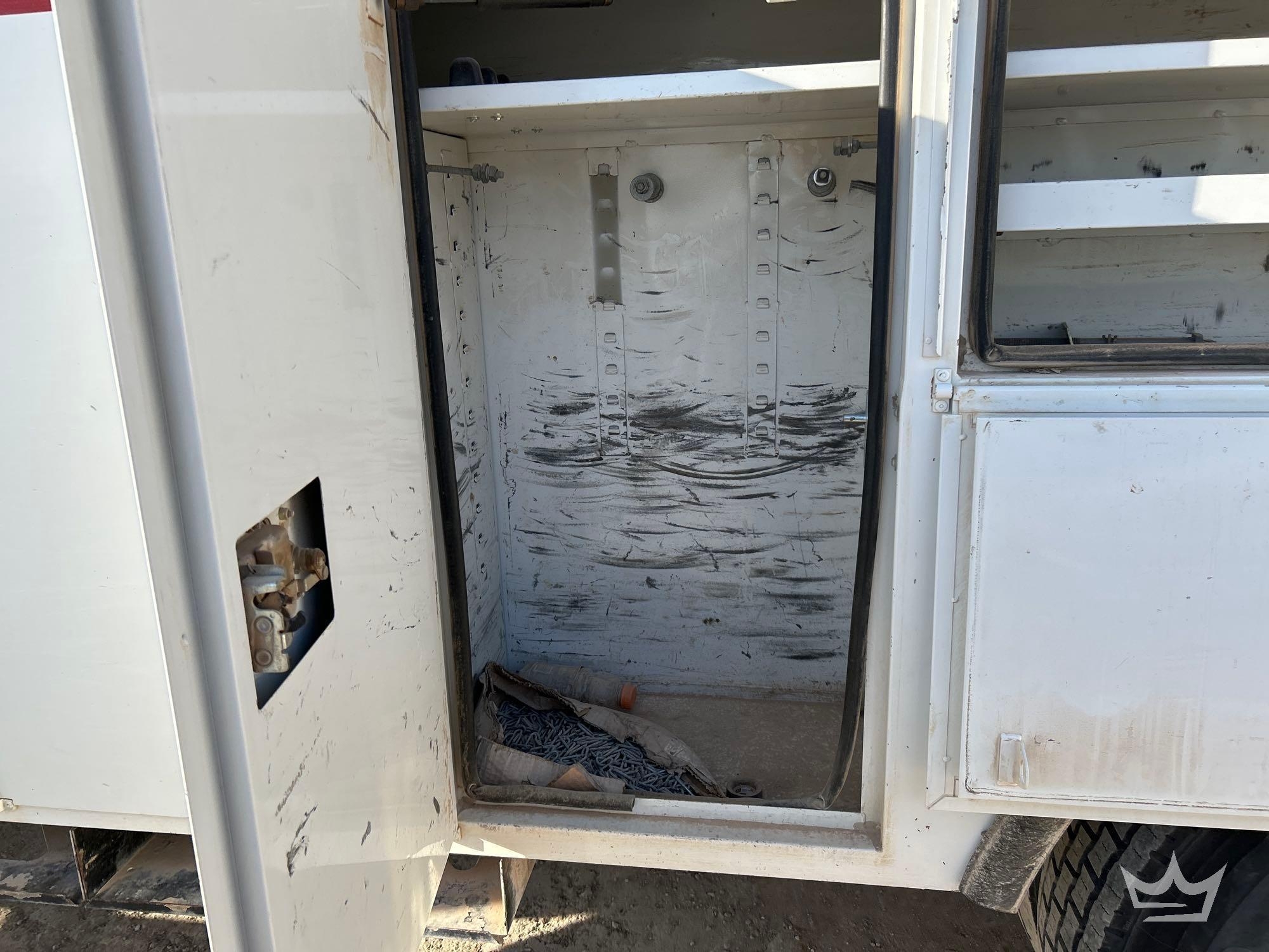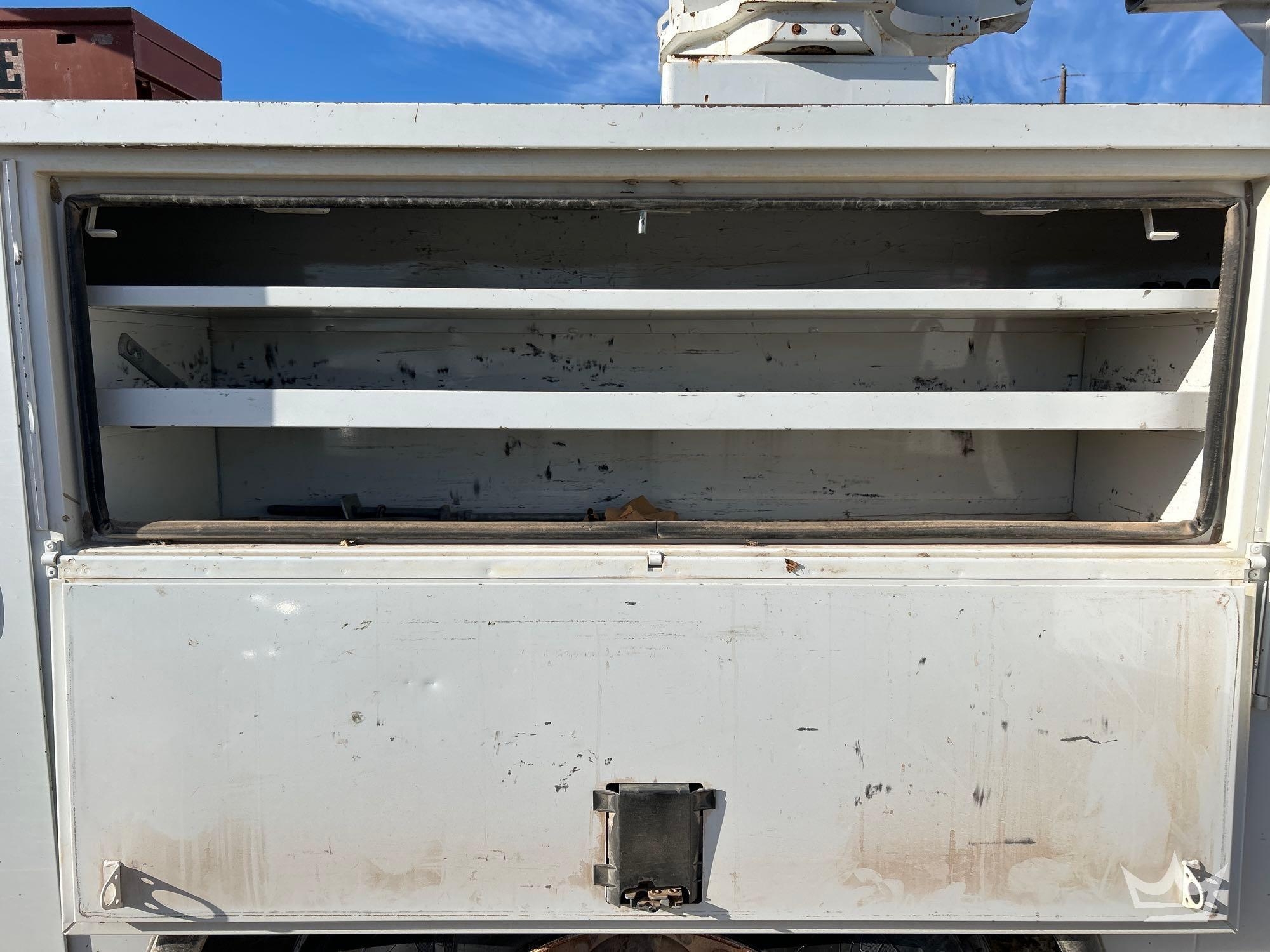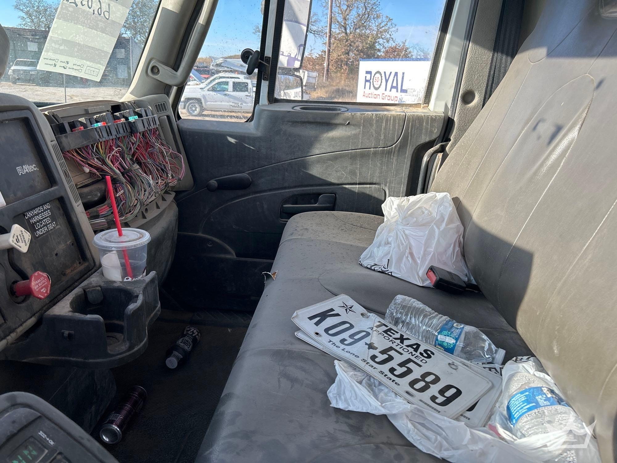 Location: Royal Auction Group, Dallas Ft. Worth, TX. VIN: 1HTWBAAN6EH756240 Odom Reads 66,052 miles, pwd by International 7.6L 6-cylinder diesel engine, Allison automatic transmission. Equipped with: Altec A55F material handling bucket boom, 55ft platform height, 700lb capacity, service body w/ cargo compartments, four wheel drive 4WD, mid and rear hydraulic stabilizers, dual rear wheels, air brakes, trailer air supply, PTO, steering wheel cruise, am/fm stereo, AC/heat. Runs, drives and operates. Limited function check completed during check in.