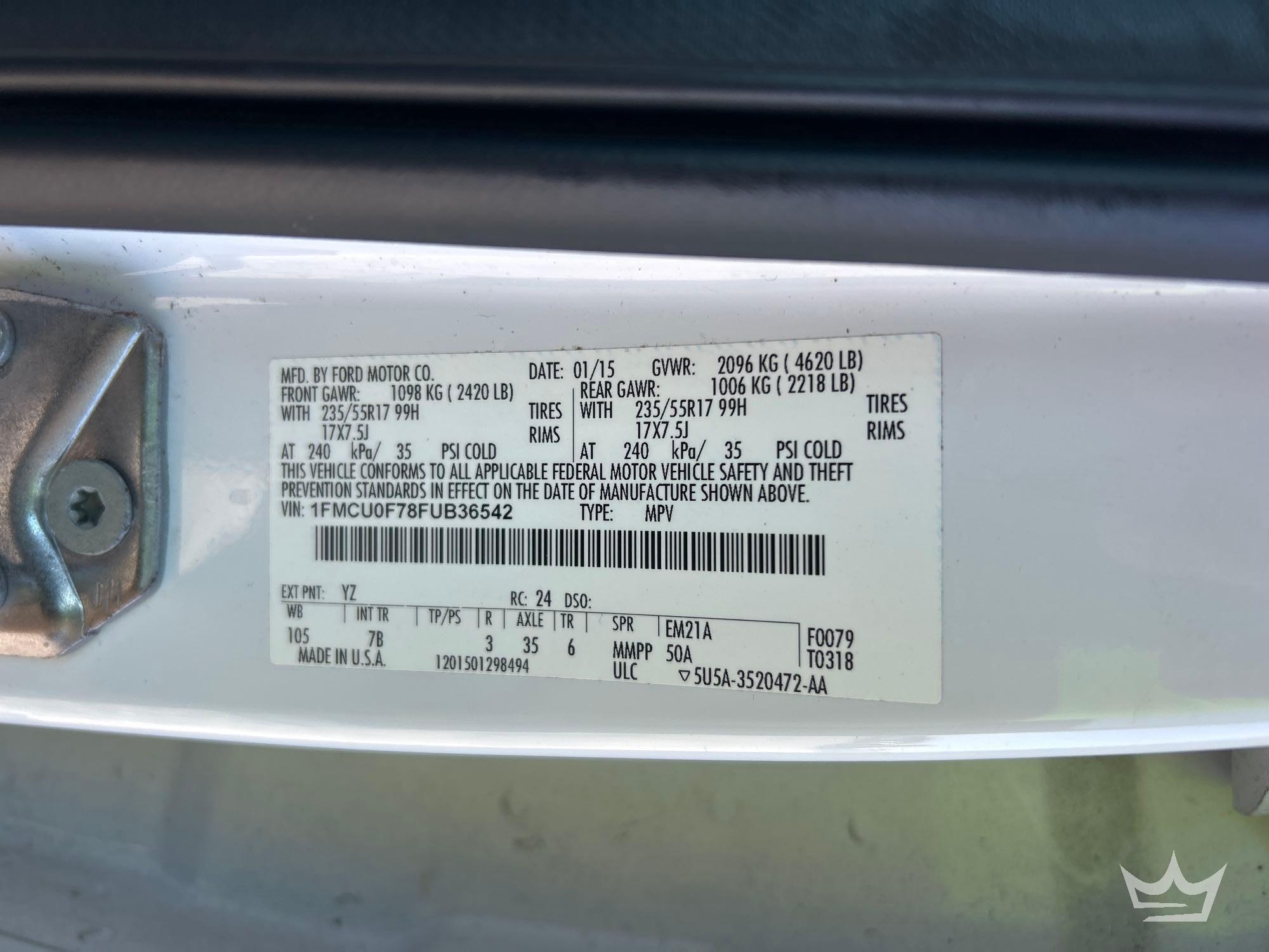 Location: Tampa, FL. VIN:1FMCU0F78FUB36542. Odom reads: 130,618 miles. Powered by a 2.5L 4-Cylinder gas engine with an automatic transmission. Equipped with: pwr: windows, locks, and mirrors, dash screen, hands-free phone connectivity, steering wheel: cruise dash screen, and phone controls, am/fm stereo with cd player, digital infotainment system, AC/Heat and 12v charger. Runs and drives, Limited function check was completed at check in.