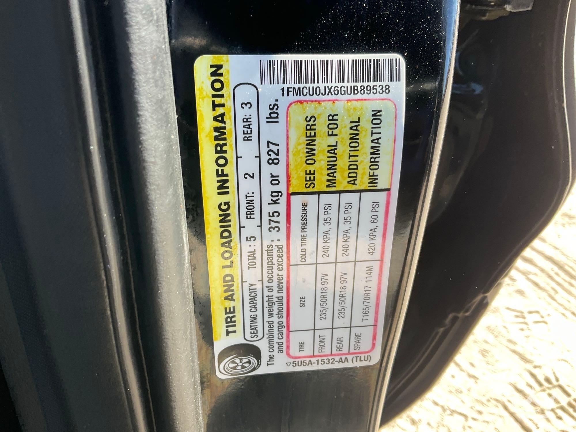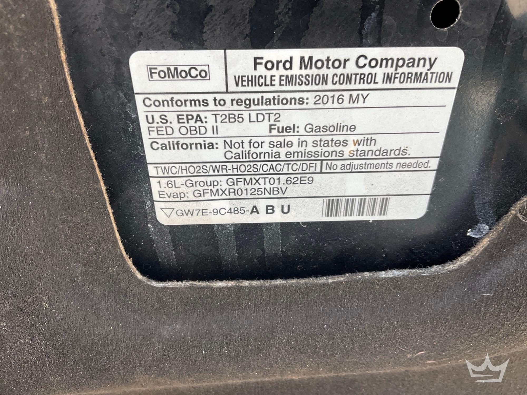 Location: Ft Myers, FL. VIN: 1FMCU0JX6GUB89538. Odom read: 141,908 mile. Powered by a 1.6L 4-Cylinder Turbo gas engine with an automatic transmission. Equipped with: pwr windows, locks, mirrors, and seat, dash screen, handsfree phone connectivity, steering wheel cruise, dash screen, media,and phone controls, bluetooth connectivity, rear backup assist camera, Sony am/fm stereo with cd player, digital infotainment system, AC/Heat, dual heated seats, and 12v charger. Runs and drives, Limited function check was completed at check in.