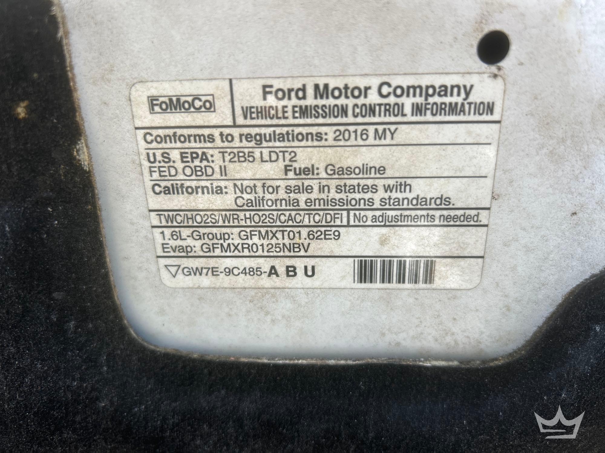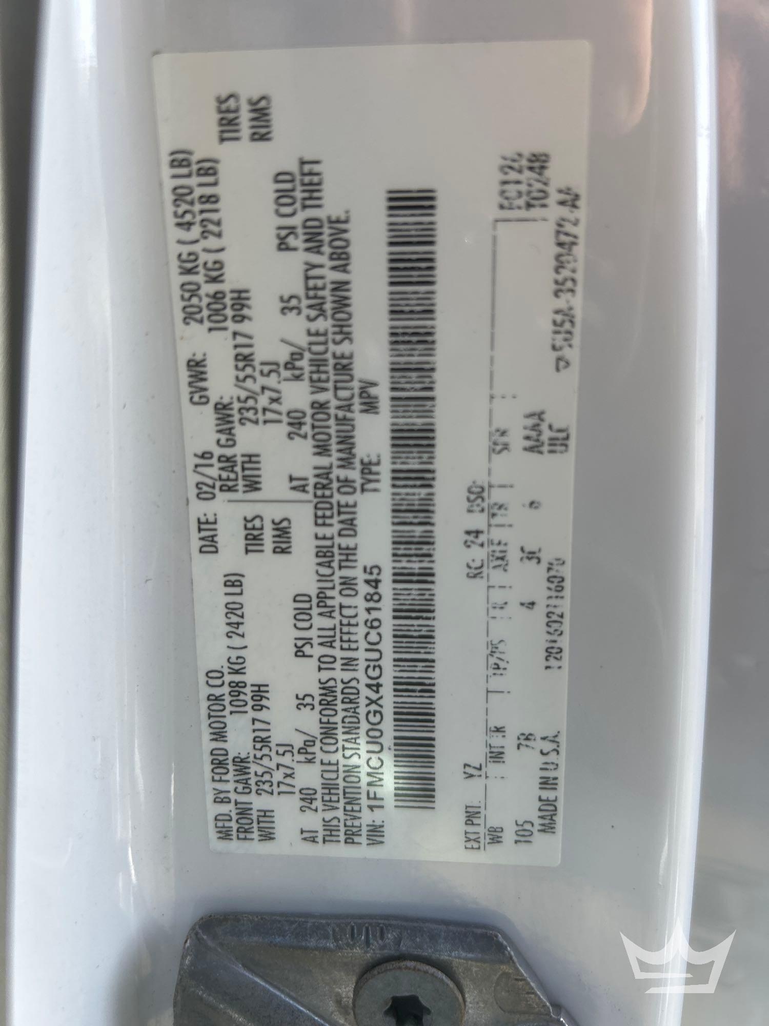 Location: Fort Myers, FL. (Charlotte County BOCC). VIN: 1FMCU0GX4GUC61845. Odom reads: 39,412 miles. Powered by a 1.6L 4-Cylinder Turbo gas engine with an automatic transmission. Equipped with: pwr: windows, locks, mirrors, and seat, dash screen, rear back-up assist camera, hands-free phone connectivity, steering wheel: cruise, dash screen, media, and phone controls, am/fm stereo with cd player, digital infotainment system, AC/Heat and 12v charger. Runs and Drives. Limited functions check was completed at check in.