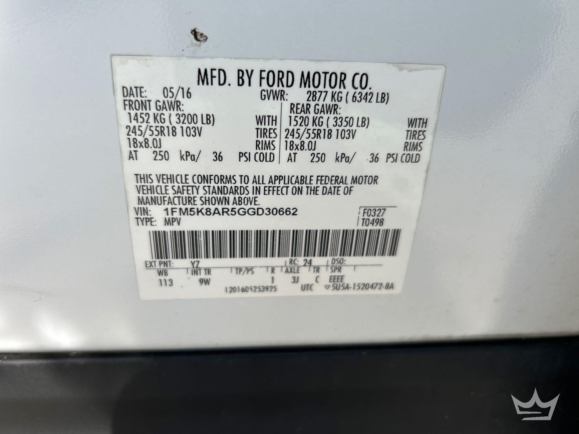 Location: Tampa, FL VIN: 1FM5K8AR5GGD30662. Odom reads: 181,364 miles. Powered by an 3.7L gas engine with an automatic transmission. Equipped with: rear assist backup camera, power window, locks, mirrors and seat, dash screen, handsfree phone connectivity, steering wheel cruise, media, dash and phone controls, am/fm stereo with cd player, digital infotainment system, AC/Heat, and 12v charger. Run and drives, Limited function check completed at check in. *Title Branded Police*