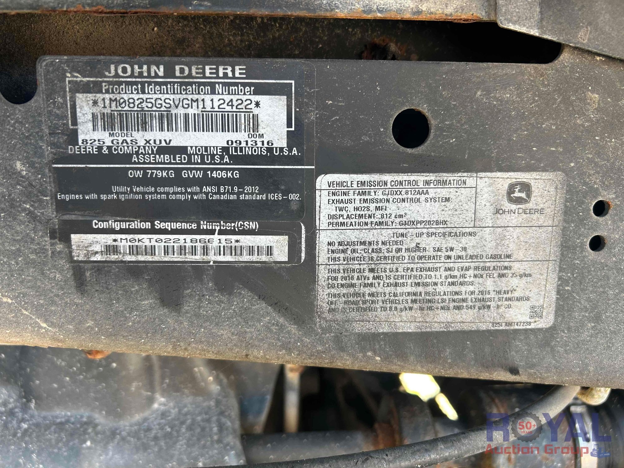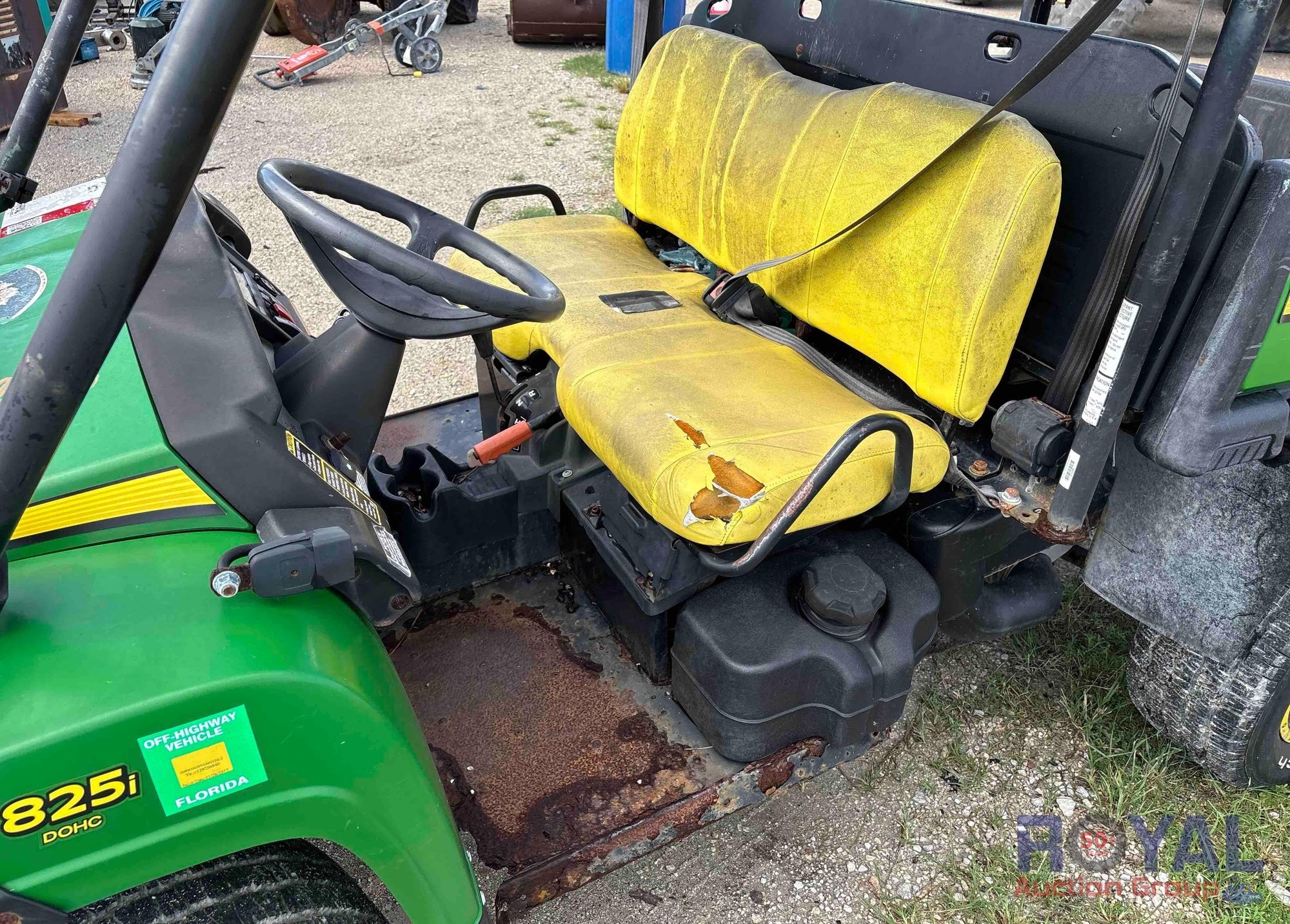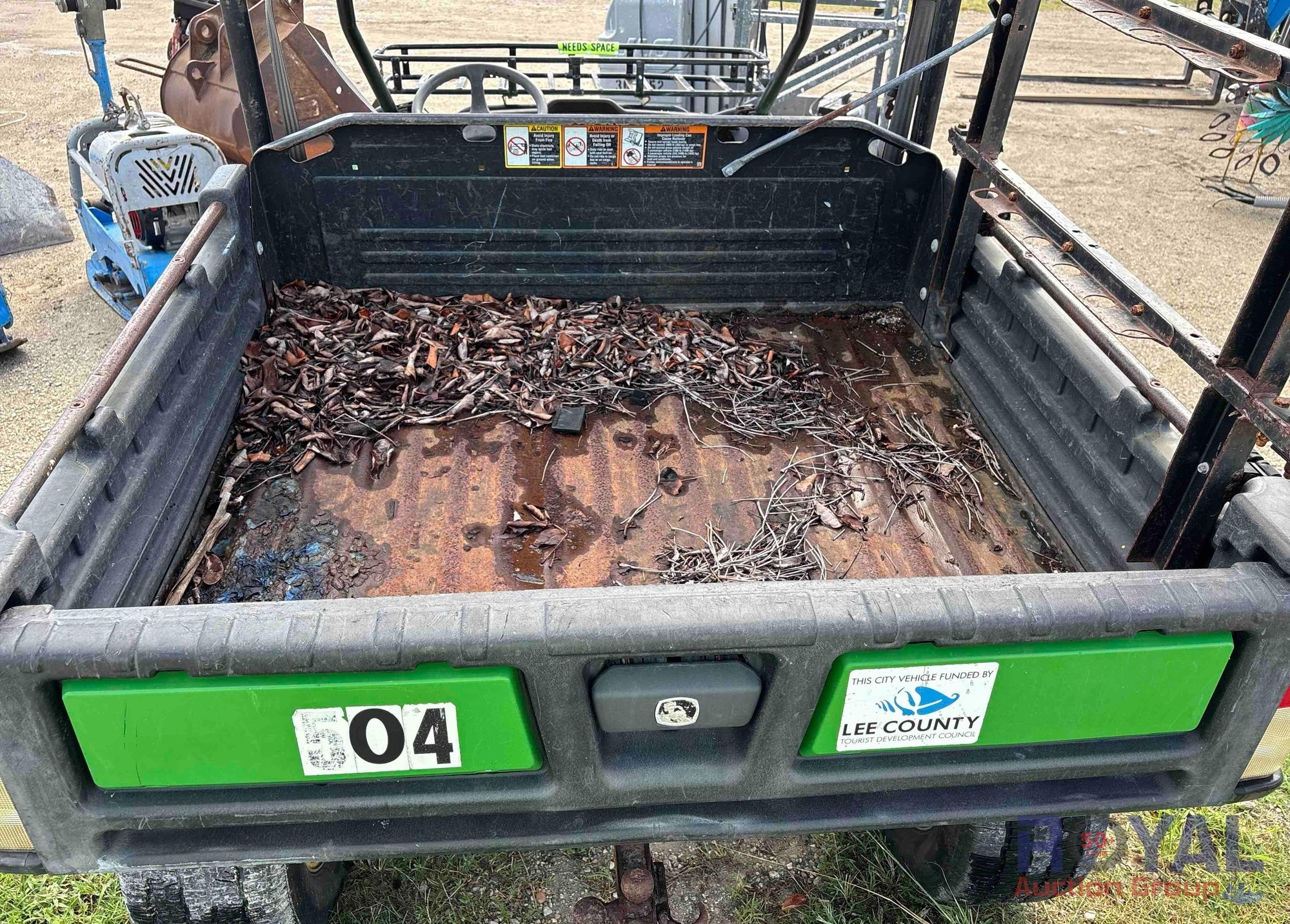 City of Sanibel, VIN: 1M0825GSVGM112422 Hours read N/A. Powered by John Deere inline 3 cylinder gasoline engine. Equipped with four wheel drive, 4WD, hydraulic lift dump bed, tow package, front bumper and headlight guard, front cargo storage rack, ROPS, 2 passenger seating, headlights, brake lights, 12v charger. *Non-Runner*