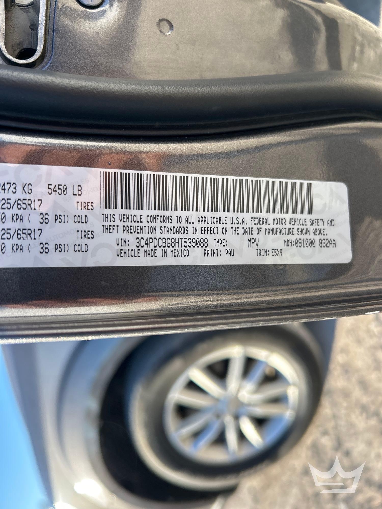 Location: Tampa, FL VIN: 3C4PDCBG8HT539088 Odom reads 155,808 miles. Pwd. by 3.6L V6 gas engine, automatic transmission. Equipped with 3rd row seating, pwr. windows, locks and mirrors, dash screen, steering wheel cruise, phone an dash controls, digital infotainment system, bluetooth connectivity, am/fm stereo with cd player, dual zone climate controls, 12v charger. Runs and drives. Limited function check completed at check in.