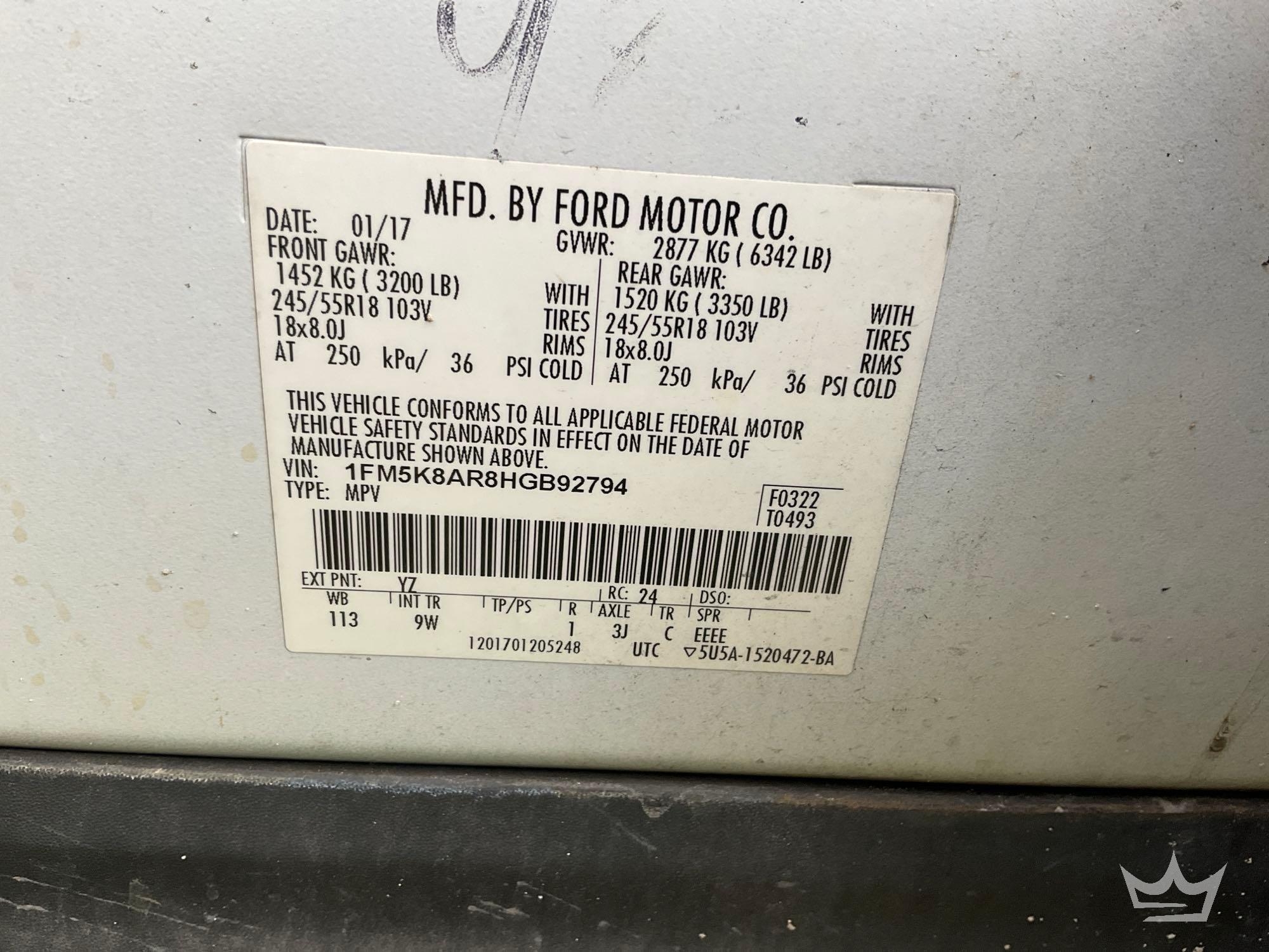 Location: Tampa, FL (City of Tampa) (982) VIN: 1FM5K8AR8HGB92794, No engine installed. Equipped with all wheel drive, power seats, windows, locks, and mirrors, steering wheel cruise controls, stereo controls, and handsfree calling, infotainment system, CD player, climate controls, 12V charging. Non runner.