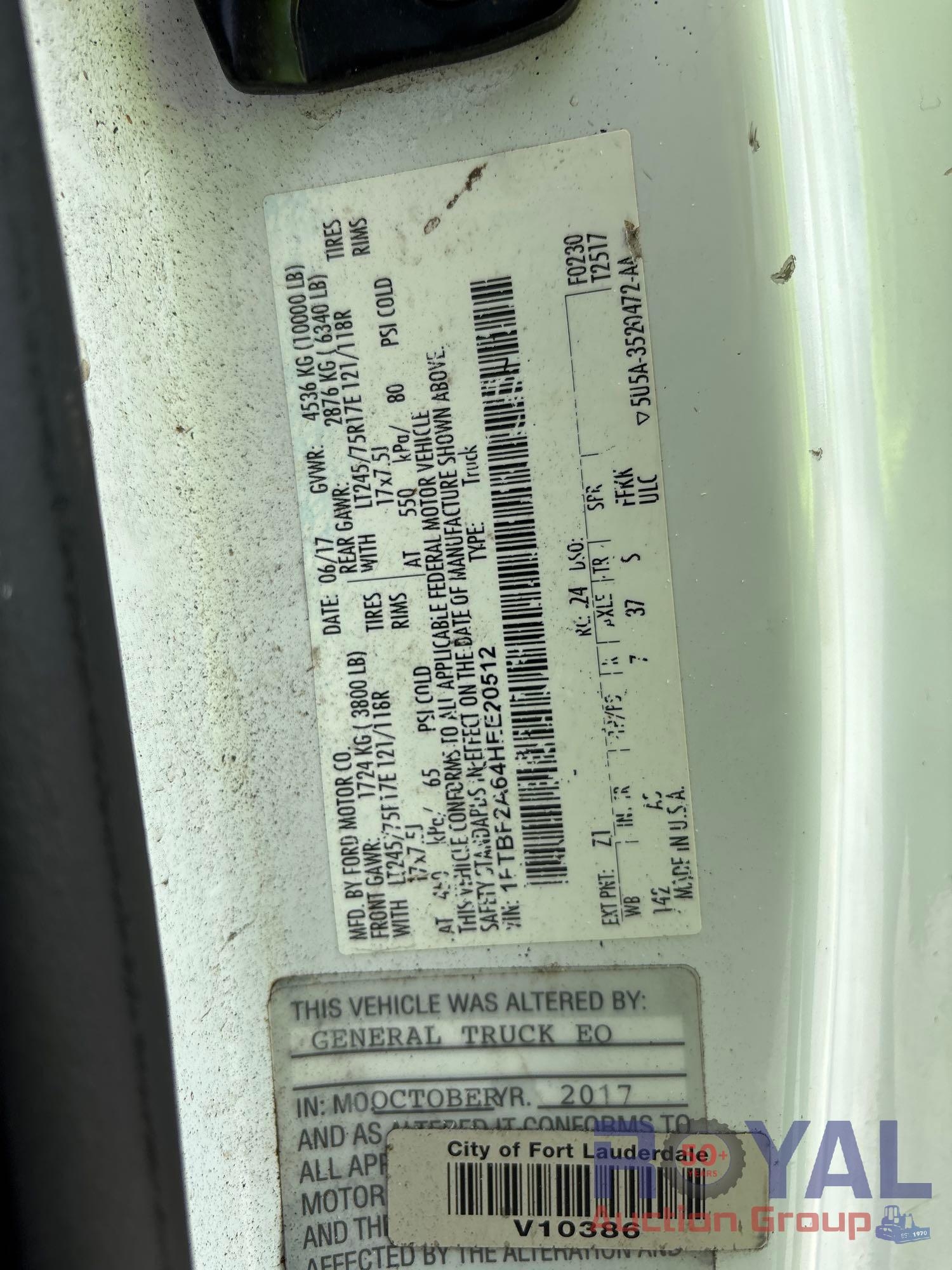 City of Fort Lauderdale (10386); VIN:1FTBF2A64HEE20512 Odom Reads 69,158 miles, pwd by 6.2L V8 gas engine, automatic transmission. Equipped with: Knapheide enclosed service body w/ cargo compartments, interior shelving, tow package, running boards, am/fm stereo, AC/heat. Runs and drives. Limited function check completed during check in.