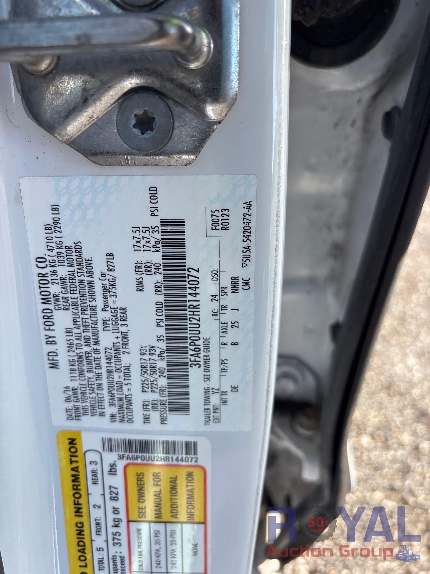 City of Ft. Lauderdale, VIN:3FA6P0UU2HR144072, Odom reads:83,314 miles. Powered by a 2.0L 4-cylinder, hybrid engine, automatic transmission. Equipped with: pwr windows, locks, mirrors, seats, dash screen, keyless ignition, bluetooth connectivity, steering wheel phone, cruise dash, and media controls, am/fm stereo with cd player, digital infotainment system, A/C/heat and 12v charger. Runs and drives. Limited function check completed at check in.