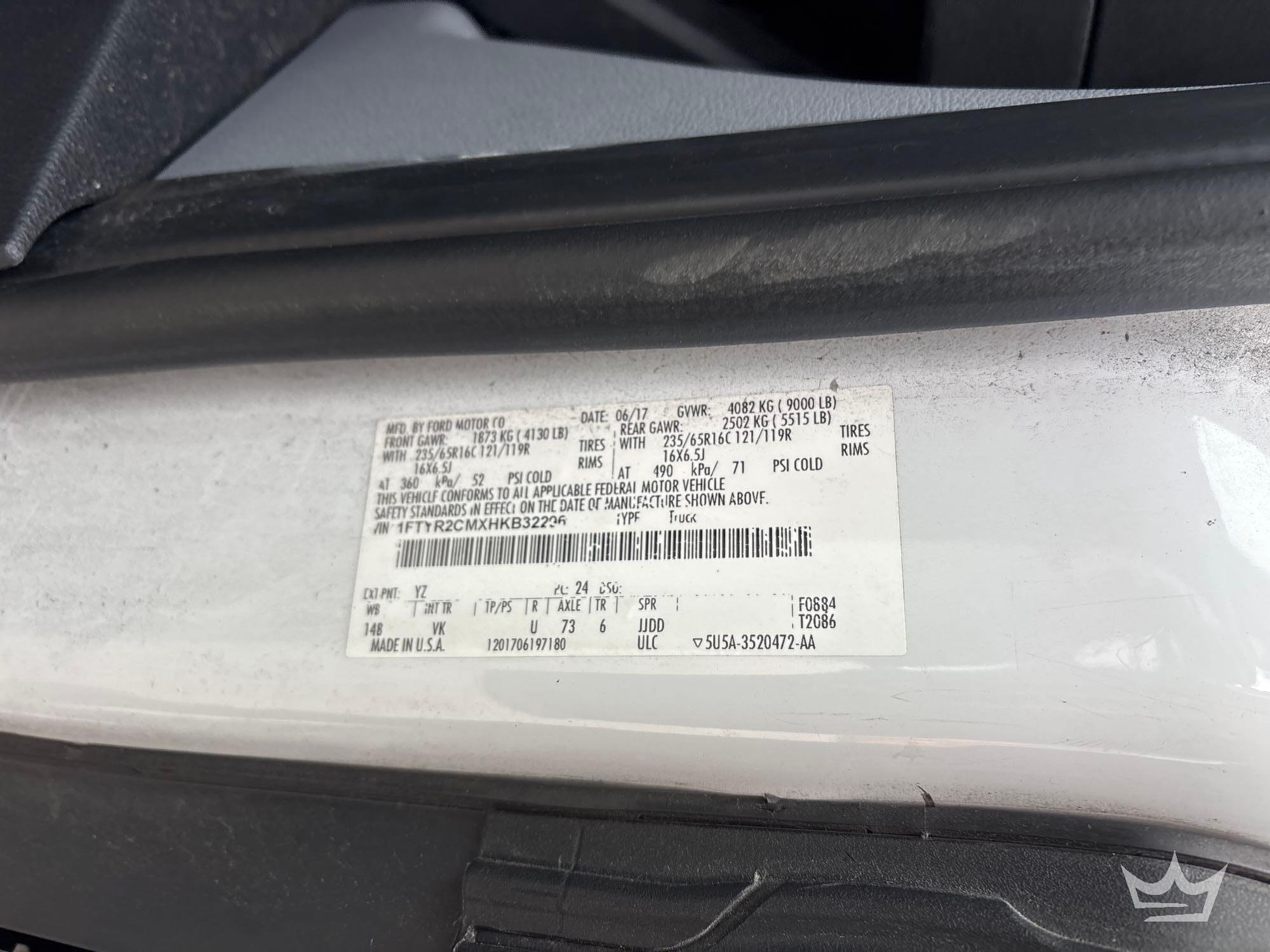 Location Fort Myers, FL. (City of Fort Lauderdale)(10351); VIN:1FTYR2CMXHKB32296 Odom Reads 79,101 miles, pwd by 3.7L V6 gas engine, automatic transmission. Equipped with: tow package, Weather Guard shelving and storage compartments, GVWR 9,000 lbs, front GAWR 4,130 lbs, and rear GAWR 5,515 lbs, pwr windows, mirrors and locks, am/fm stereo, AC/heat, 12V charging ports. Runs and drives. Limited function check completed during check in.