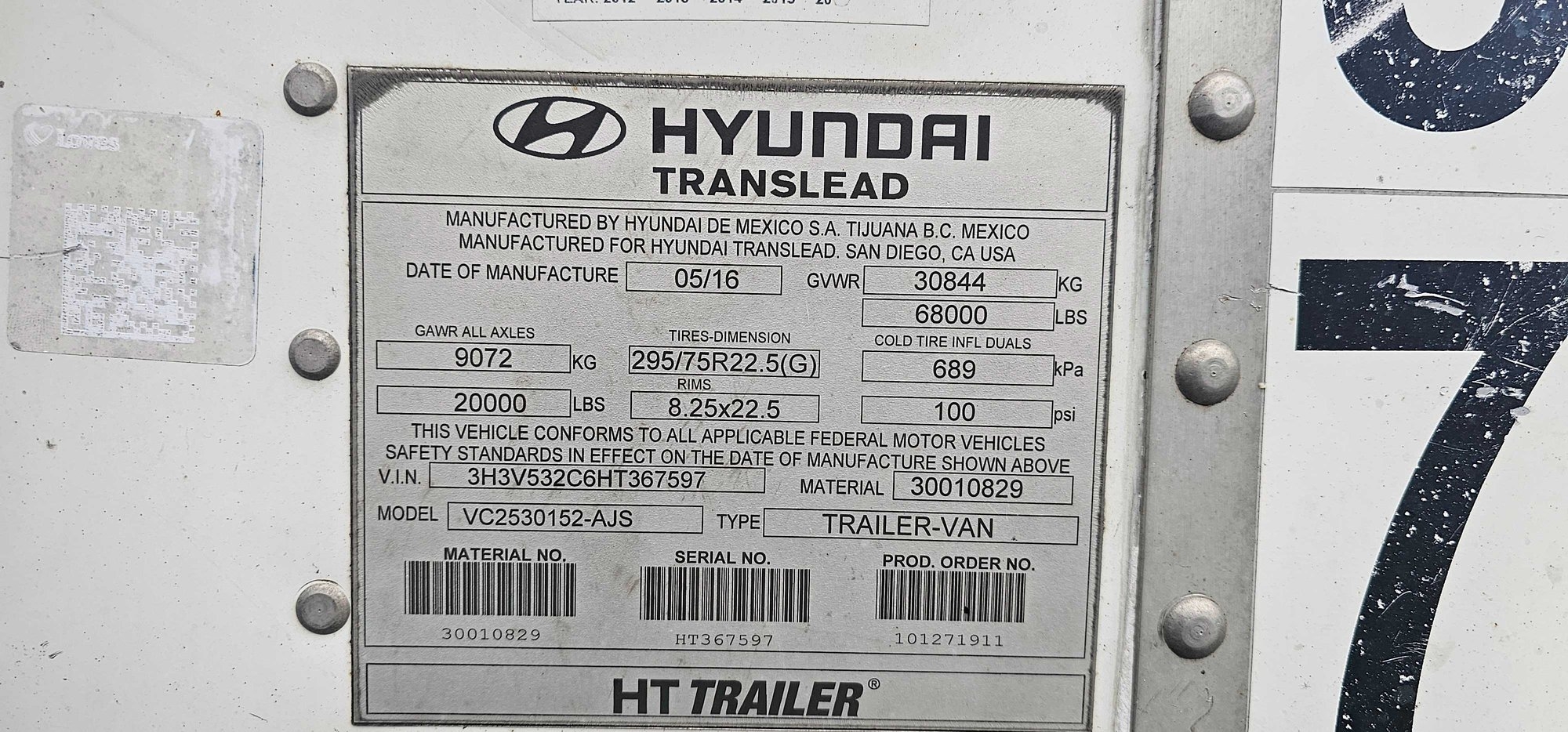 2017 HYUNDAI TRAILER 53' MODEL: VC2530152-AJS GVWR: 68,000 LBS GAWR: 20,000 LBS VIN #: 3H3V532C6HT367597 Features and Notes:
