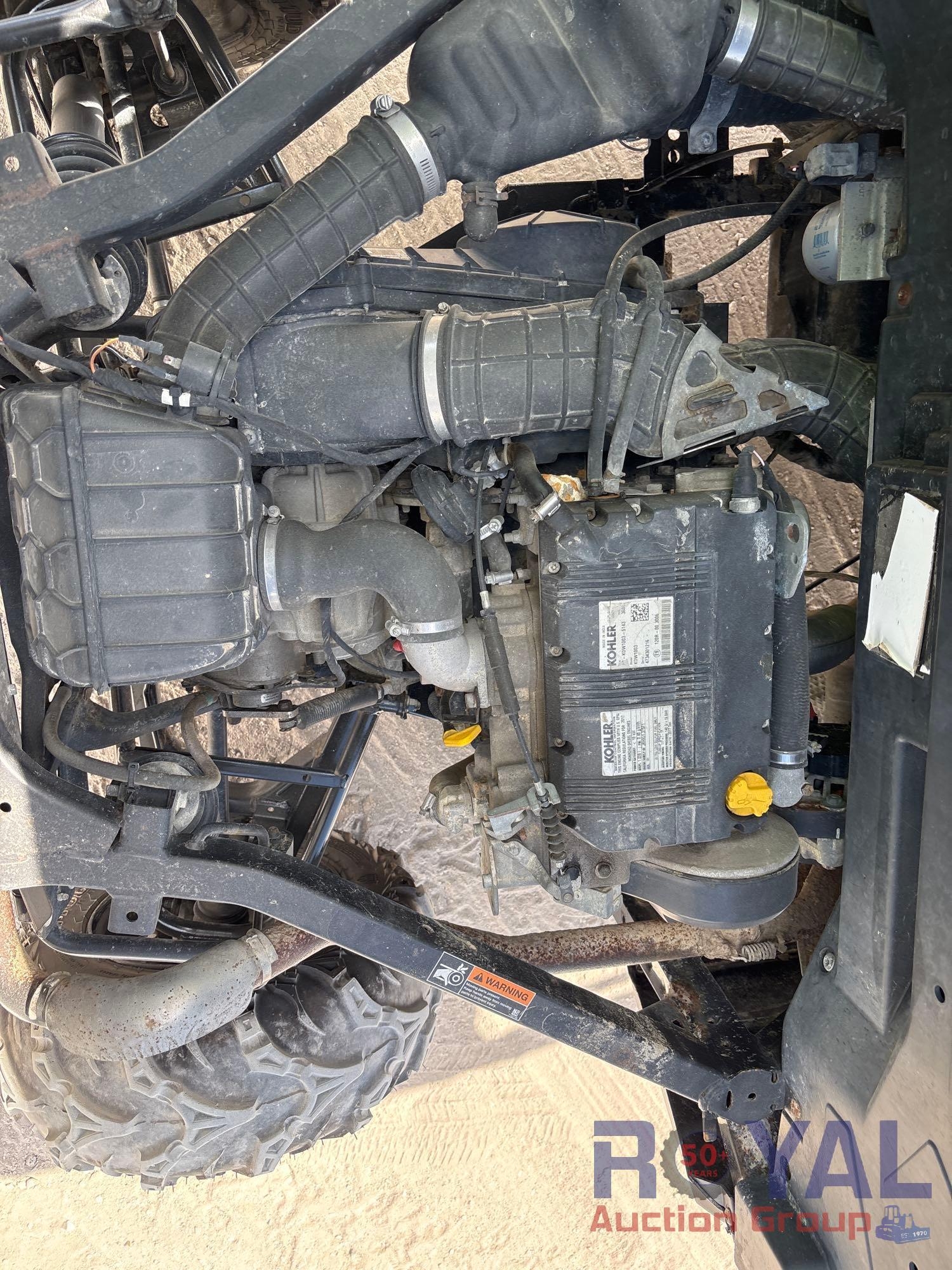 Hours read 1,230 hours, pwd by Kohler KDW1003 3-cylinder diesel engine. Equipped with: On-Demand True AWD/2WD/VersaTrac Turf Mode, tow package, manual tilt cargo box, 1,000 lbs cargo bed capacity, 1,500 lbs payload capacity, 3-person seating, from bumper guard, ROPS, canopy cover, headlights and tail lights, strobe light. Runs and drives. Limited function check completed at check in.