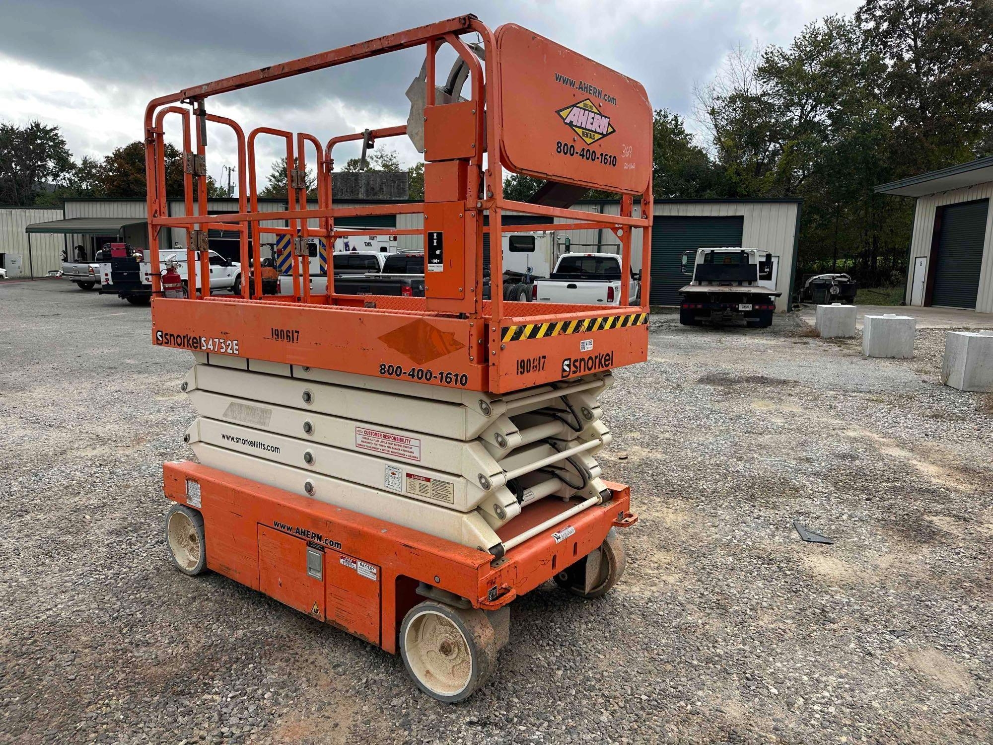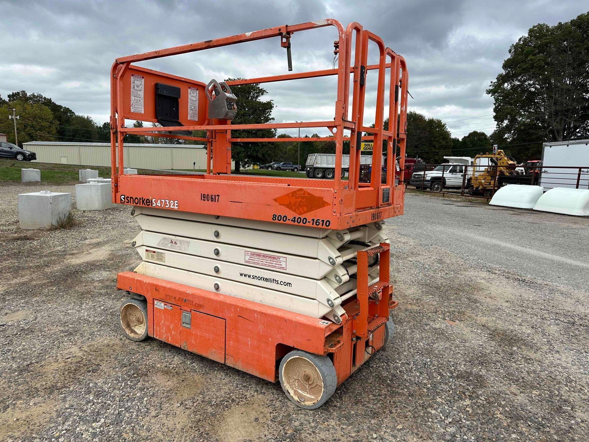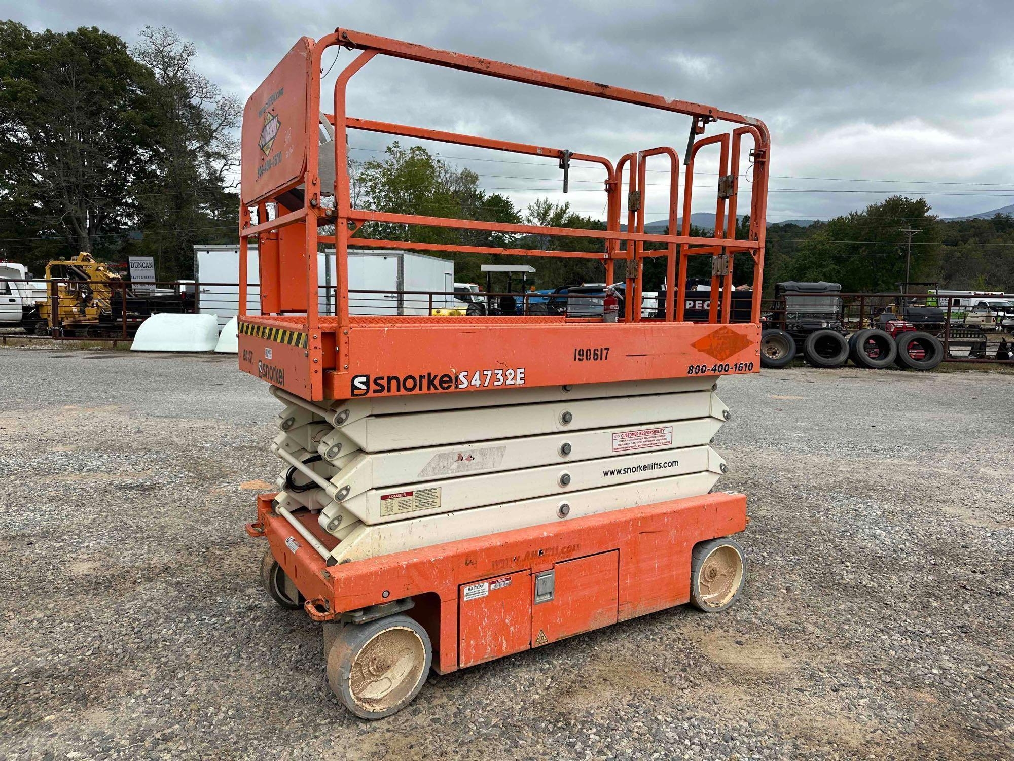 Located at lot in Blairsville, GA - 2017 Snorkel S4732 scissor lift - Serial: S4732E-04-170401160 - Batteries dead - Unknown condition