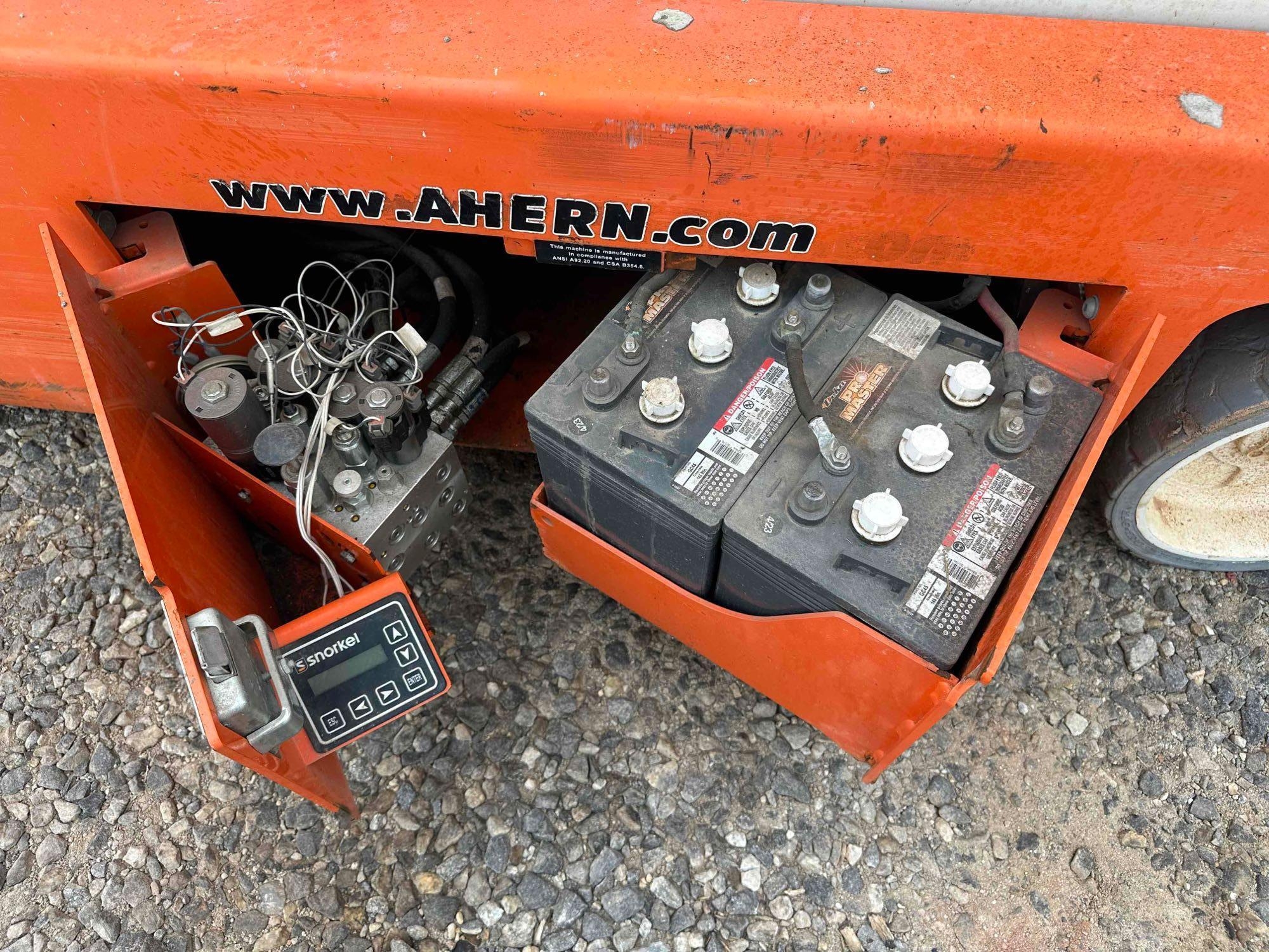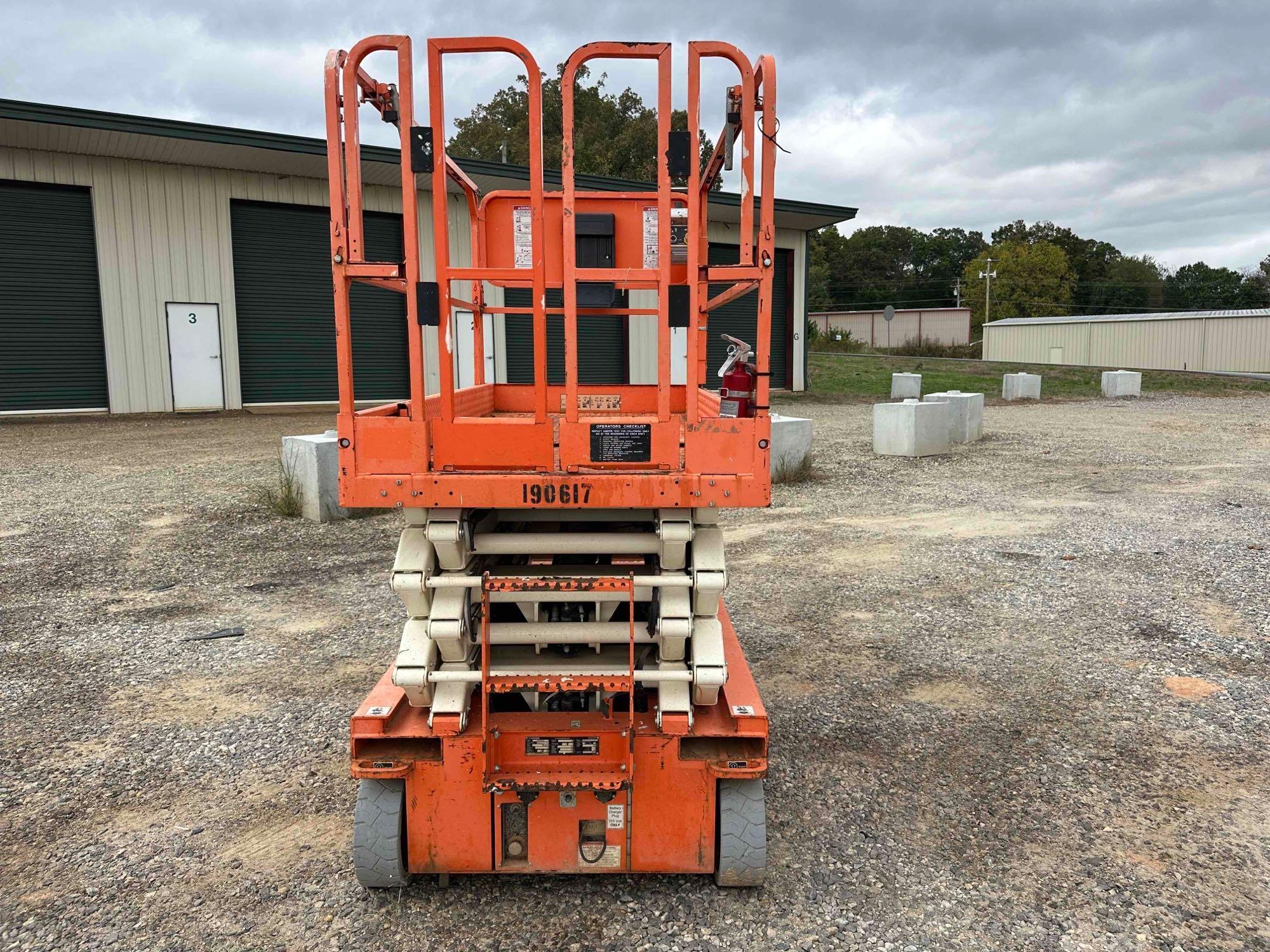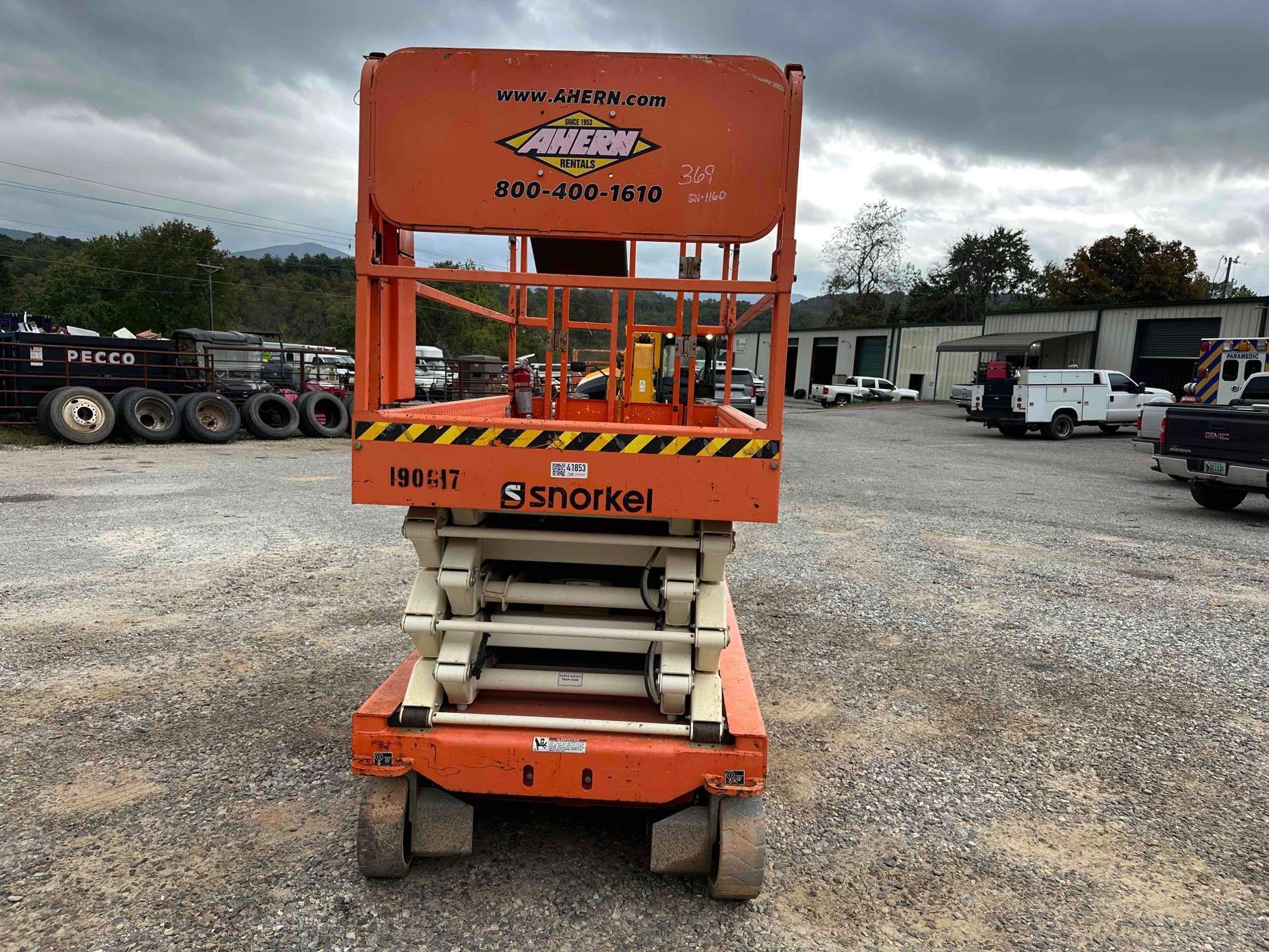 Located at lot in Blairsville, GA - 2017 Snorkel S4732 scissor lift - Serial: S4732E-04-170401160 - Batteries dead - Unknown condition