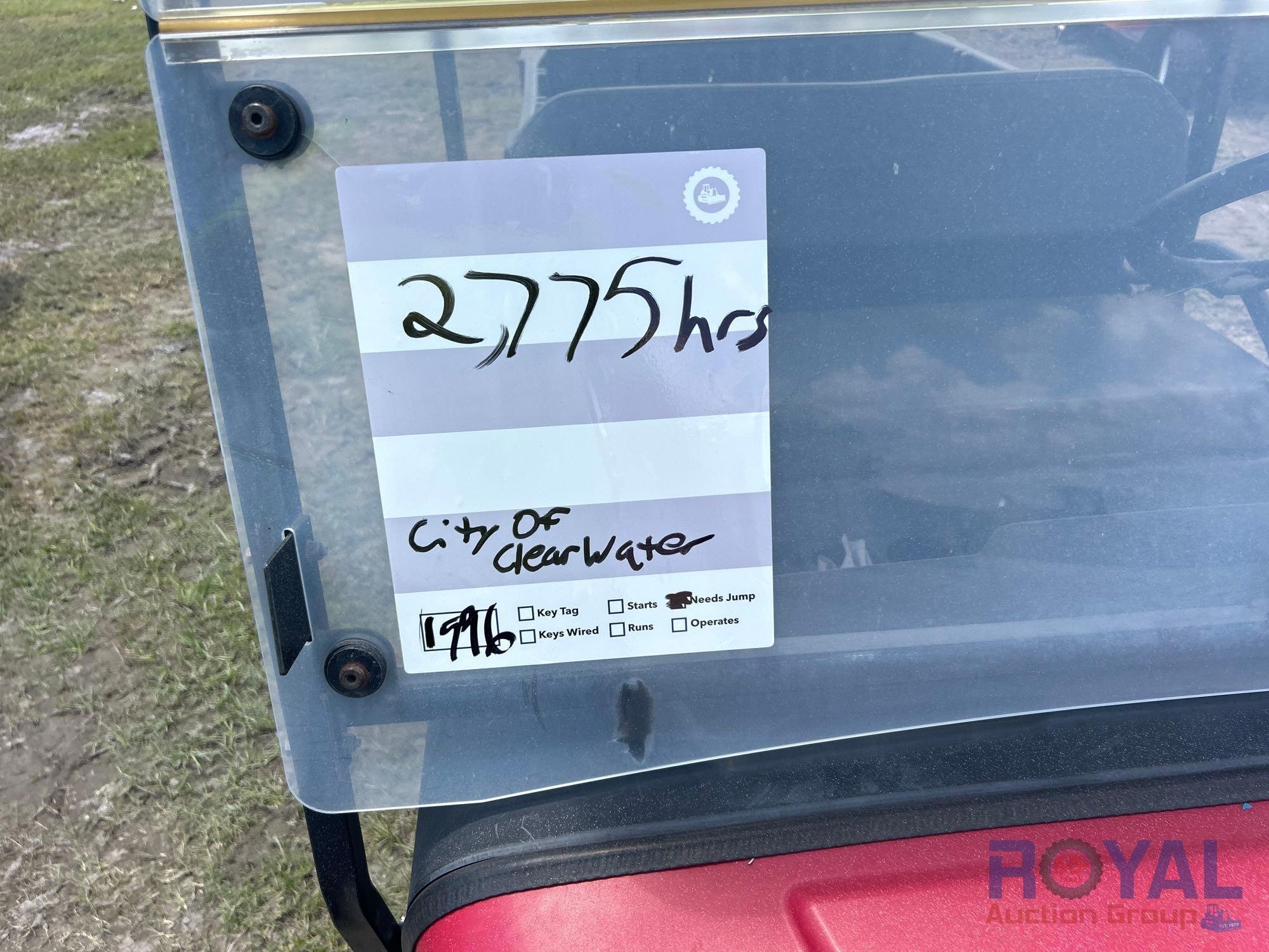 City of Clearwater (G4732), Hours Read: 2,775 hours. Powered by a 48V electric battery system. Equipped with utility bed, tow package, front bumper bar, two person seating, rearview mirrors, canopy. Powers up and drives, Limited function check completed at check in. Flood Damaged.