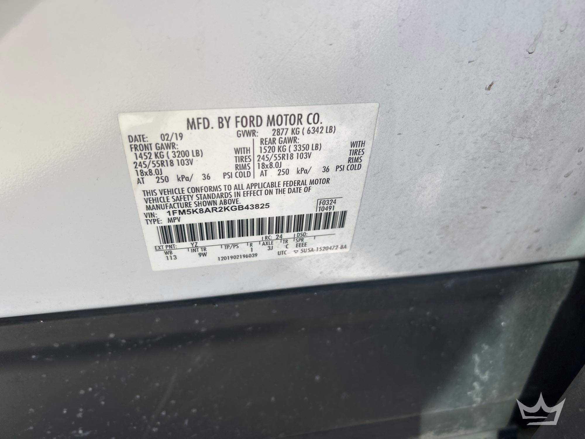 Location: Tampa, FL (Orange County Sheriff) VIN: 1FM5K8AR2KGB43825 Odom reads 169,246 miles. Pwd. by 3.7l V6 gas engine, automatic transmission. Equipped with all wheel drive, AWD, pwr. windows, locks, mirrors and seat, dash screen, steering wheel cruise, phone, media and dash controls, digital infotainment system, bluetooth connectivity, am/fm stereo, heat and a/c, back up camera, 12v charger. Runs and drives. Title branded police.