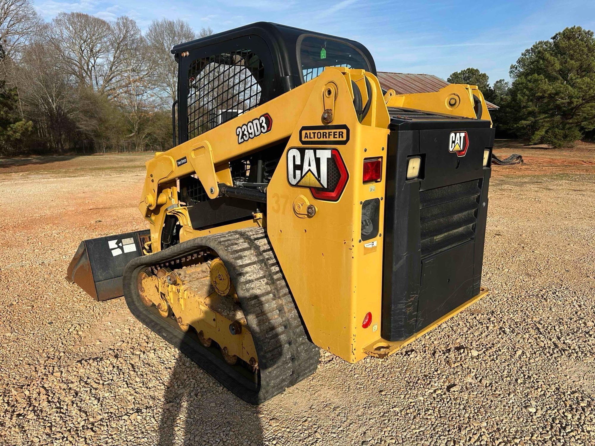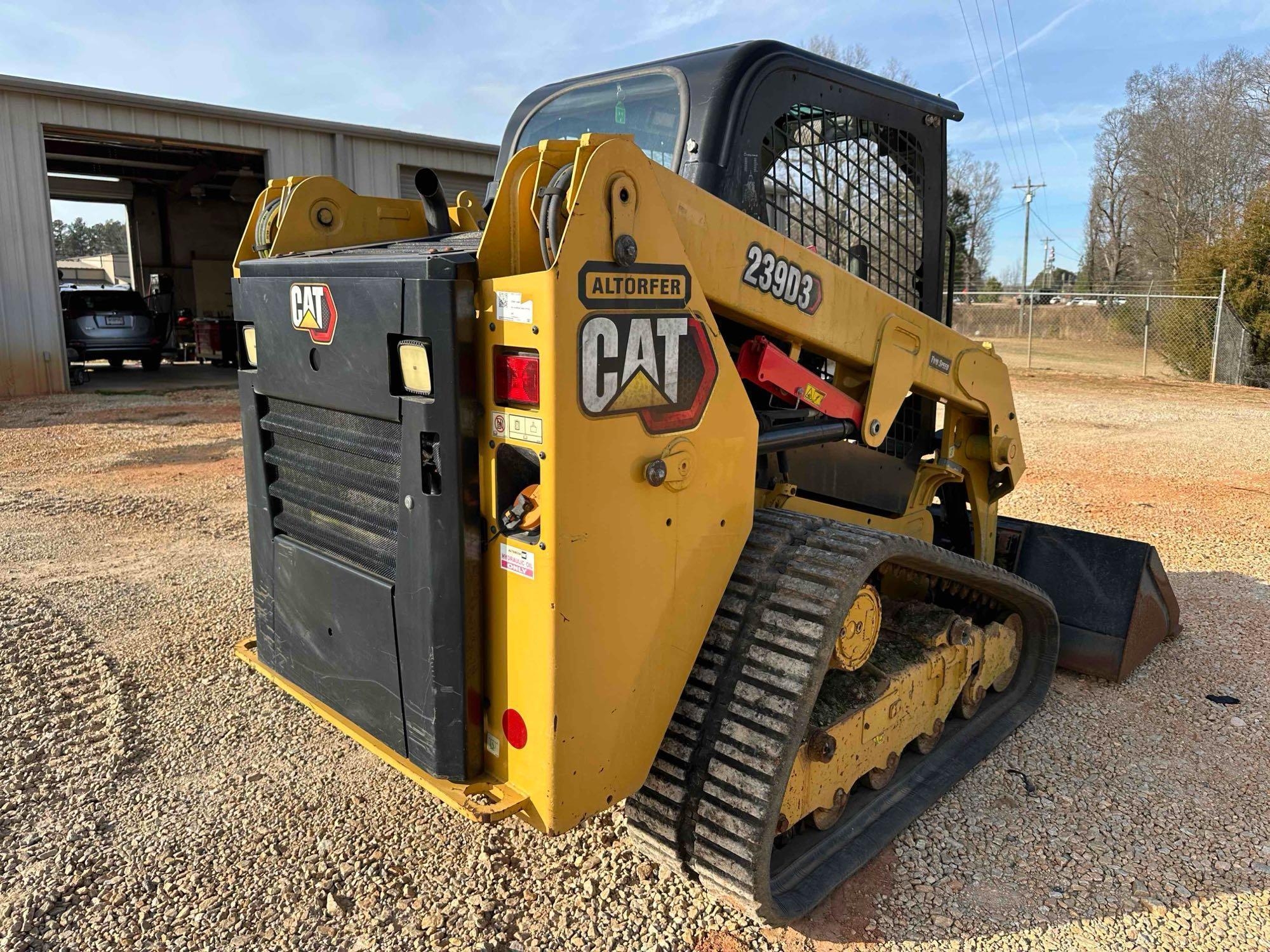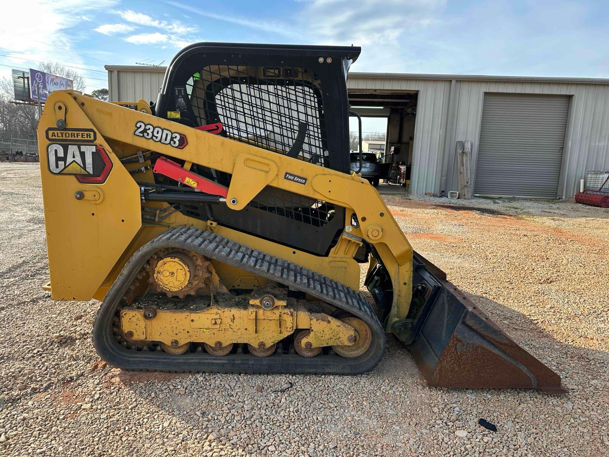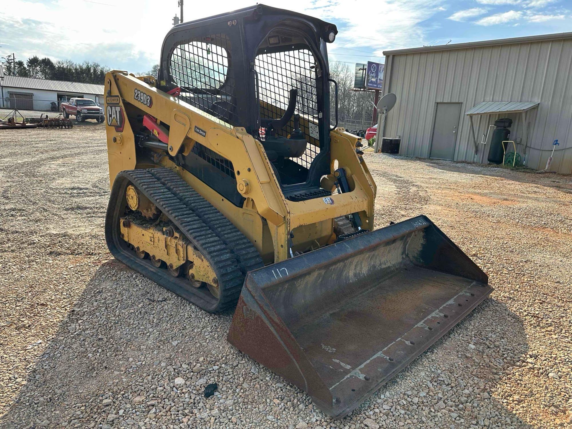 Located offsite in Carnesville, GA - 2020 CAT 239D3 Compact Track Loader - hours 570.2 - 67hp - 7,434 operating weight - 1,530m lift capacity - open station - wide rubber track machine with 80% rubber left - 2 speed transmission - joy stick controls - standard aux. hydraulic - 6ft tooth bucket - runs/operates