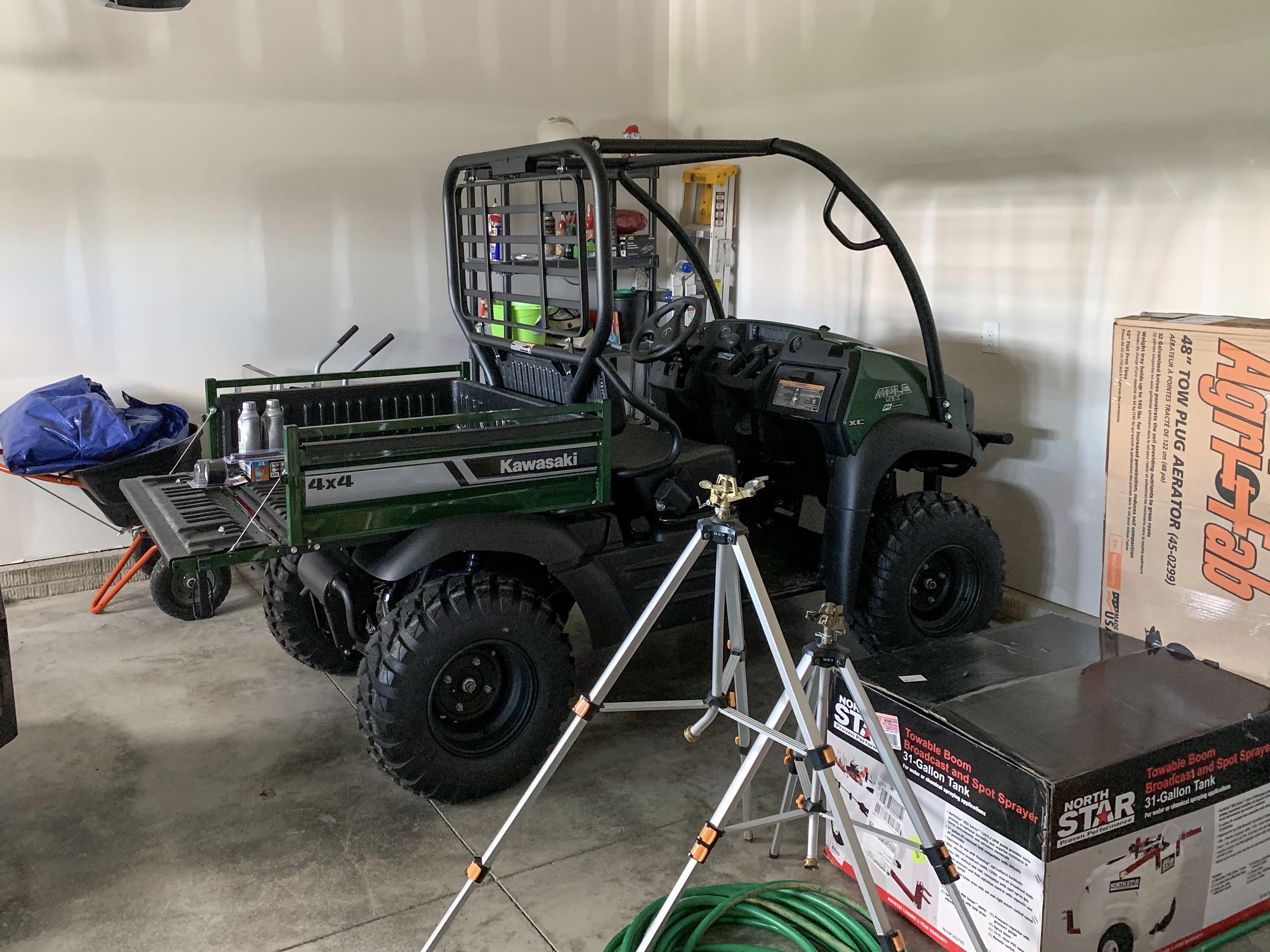 It looks like the base MSRP on the Mule SX 4x4 is $8,099 + $500 rebate and the Massimo T-Boss 410 is MSRP $6,999. The difference comes in where the Massimo comes with a 3,000lbs winch, disc brakes, liquid cooled engine, larger fuel capacity (6.9gal vs. 4.2gal), a hydraulic assisted lift bed (vs. manual on the Mule), plus some nice accessories like speedometer (important to me for pacing fertilizer/weed control), side mirrors, plastic roof, and hitch receiver.