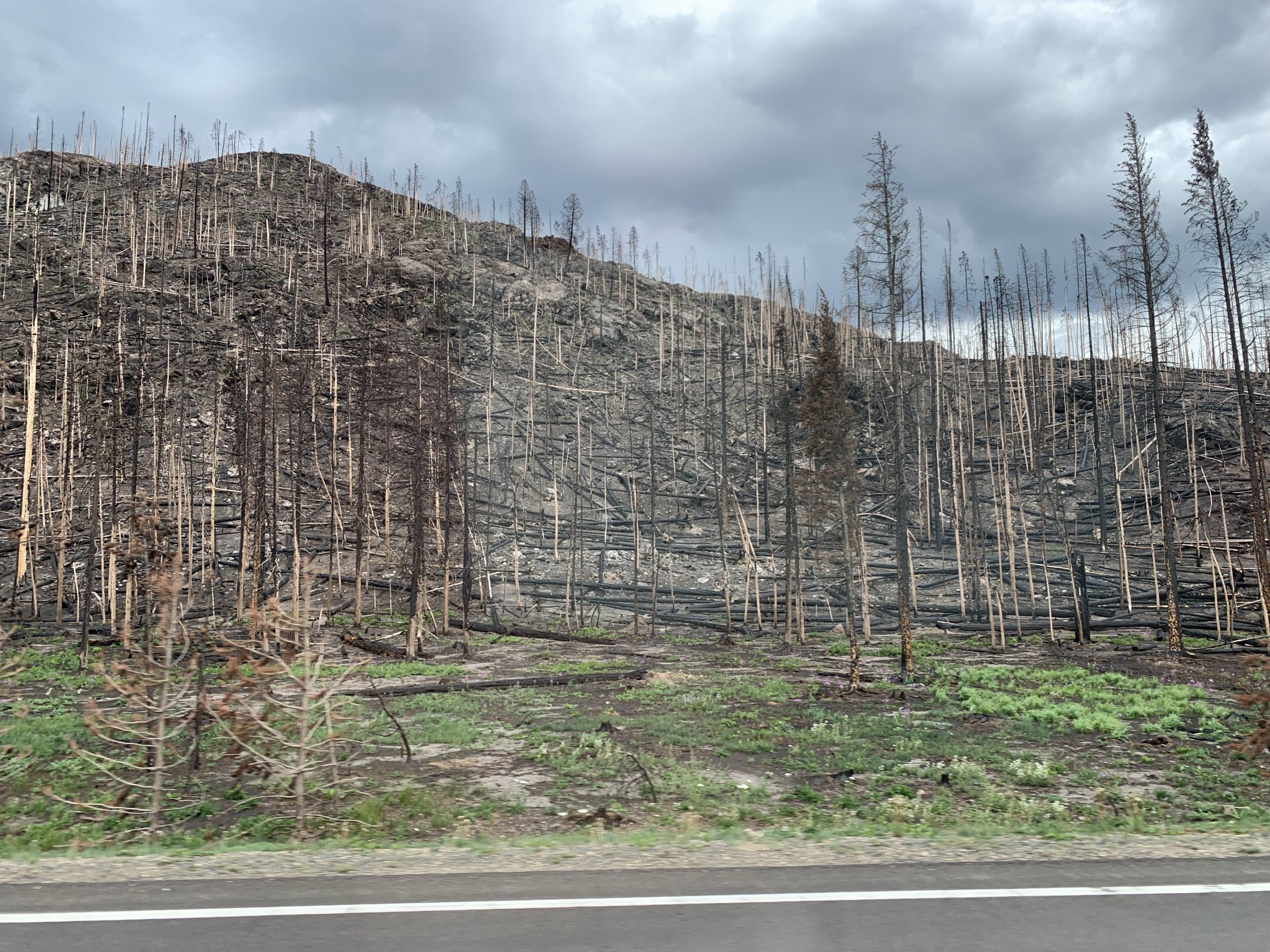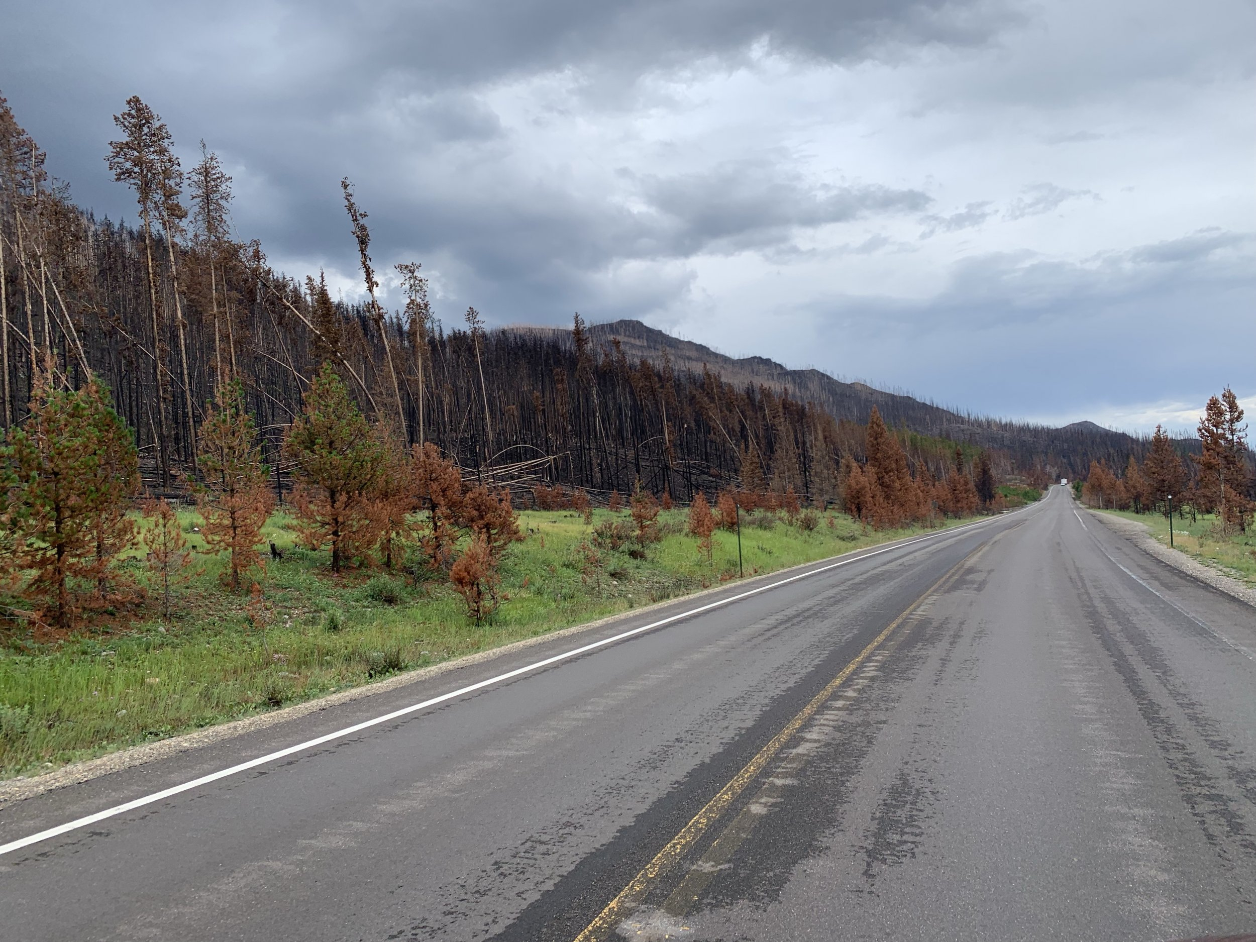 Here’s some pics from yesterday at Rocky Mountain National Park. Miles of forest and entire mountains cooked. What one of the knowledgeable locals told us was that in warmer cycles, the wood boring beetles have more time to breed and when more breed, more trees die from the beetles. This creates more dead, dry trees so when a camper does something stupid, or there’s a lightning strike, the results are more catastrophic
