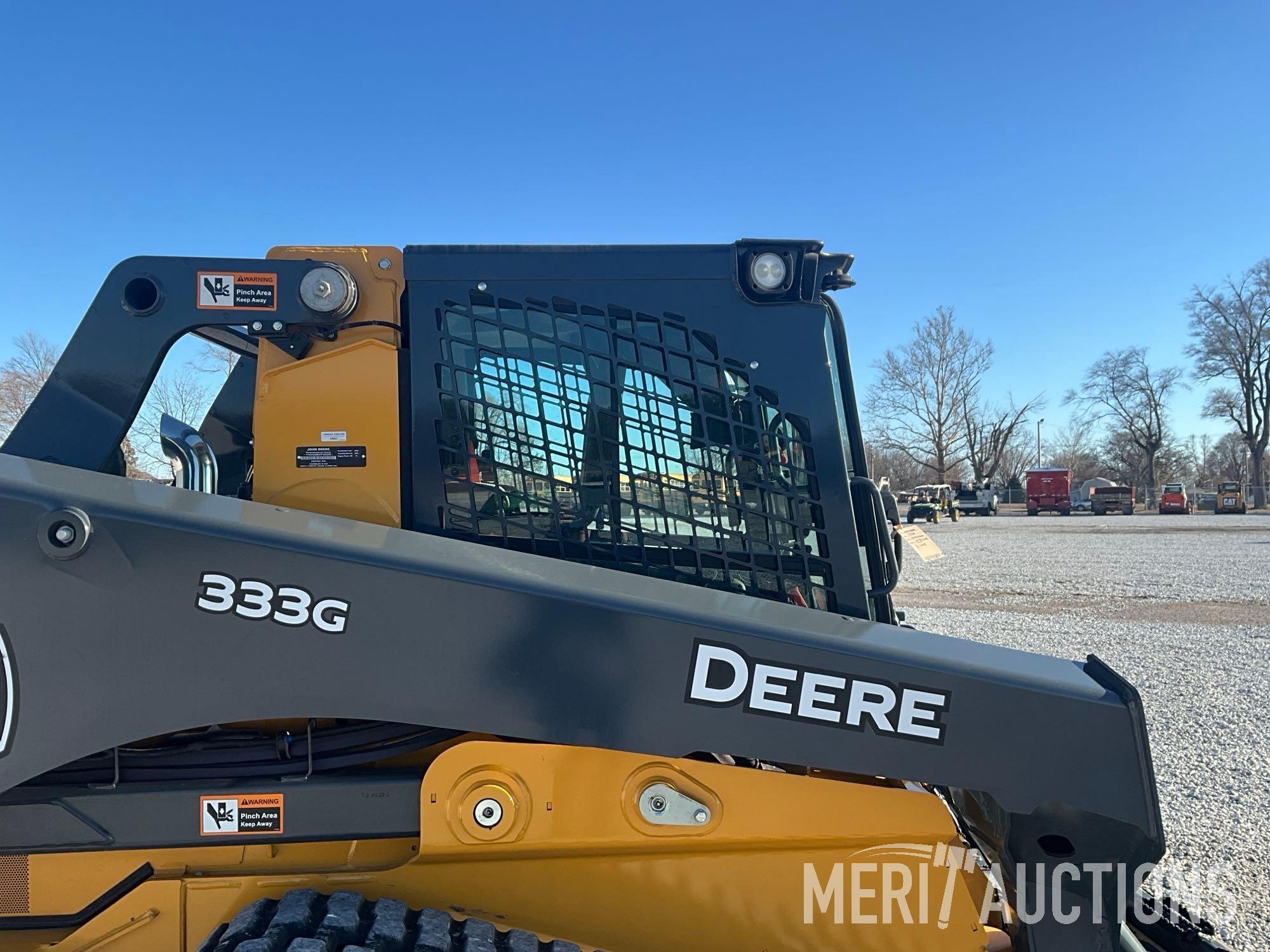 2023 John Deere 333G Track Loader, Hours: 200. CAB w/AC, High Flow Hydraulics, Ride Control, 2-Speed, EH Joystick Switchable Controls, Rear View Camera, Radio, Antivibration Suspension Undercarriage, Air Ride Seat w/Heat, Engine Pre-Cleaner, Power Quick Attach, 84in Bucket, Wide Rubber Tracks. SN: 1T0333GMHPF453208 Emissions Warranty Through December 1st 2028 or 3000hrs.