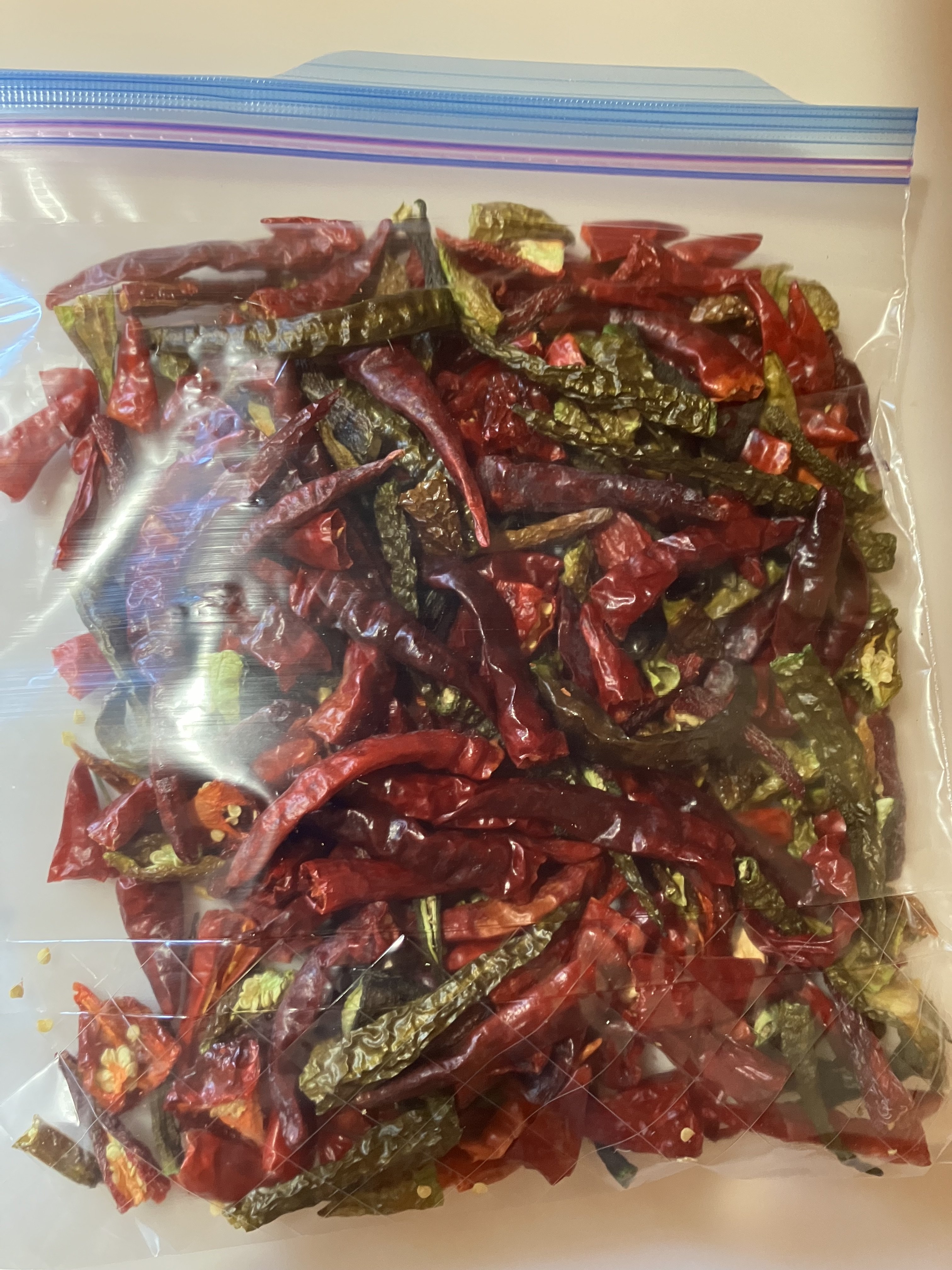 We had a freeze predicted for last night, so I picked my hot pepper garden yesterday morning, cleaned and sliced, then dehydrated out in the shed for about 36 hours. I grind them up in a food processor to make chili death powder. I've been doing this for about 20 years.