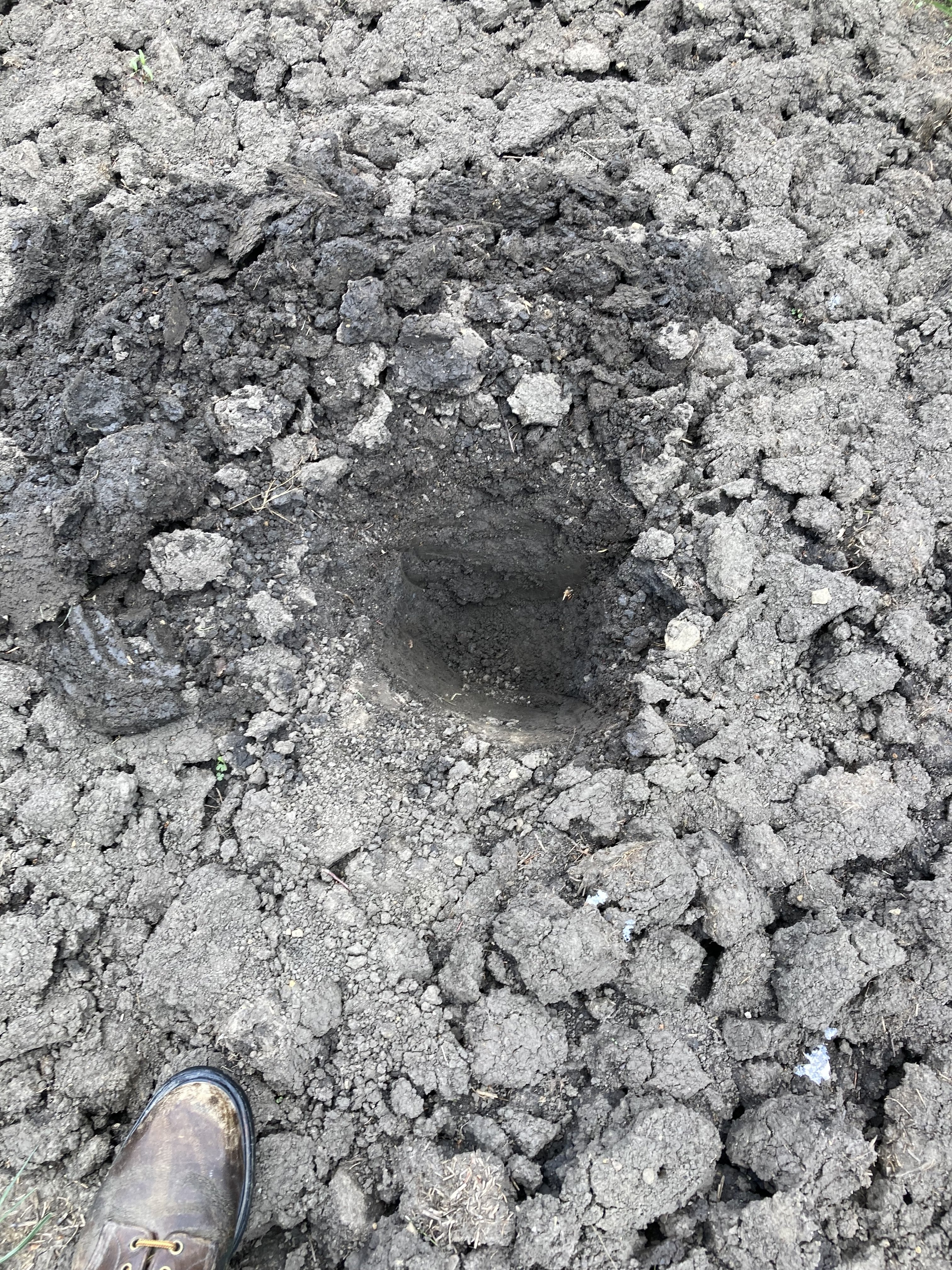 Here's a plant and the hole I dug to put it in. I will bury the plant and just leave maybe two or so inches above grade. As they grow I snip a few bottom branches off so they don't hit the ground and spread bacteria. I don't bury the root ball sideways as shown and we straightened it before back filling dirt. Photo is not real accurate but it's all I've got.