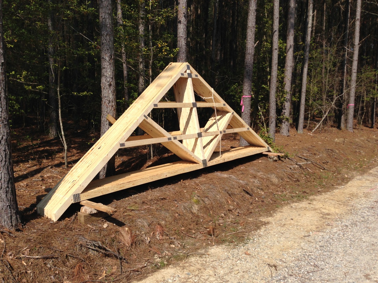 The driver dropped the bundle near our driveway entrance since I didn't have the heart to make him back 500 feet down a curvy driveway. I then carried them into the site with my tractor, 3-4 at a time, and stacked them across our driveway from the barn site. In retrospect, I probably could have forked the entire bundle in one shot, but was not able to judge the bundle weight properly and didn't want to lift a 22 foot wide load to find out if it was doable. Especially since I had to lift them 5' off the ground to clear my entrance gate posts! The trusses seem to weigh 100-120# each, since I could lift and move them individually, but again the 22 foot length makes it hard to judge.
