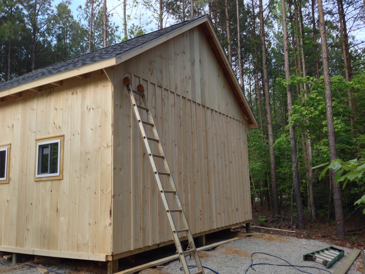 Siding will be white pine, board & batten. Roof will be architectural asphalt. Goal was to make it look similar to our home (otherwise I would have preferred metal siding and roof for cost/maintenance). I will probably stain/paint the barn classic red, but still thinking that over. I'd prefer to leave the wood raw, but carpenter bees would likely go after it. Paint hides the grain and keeps them away.
