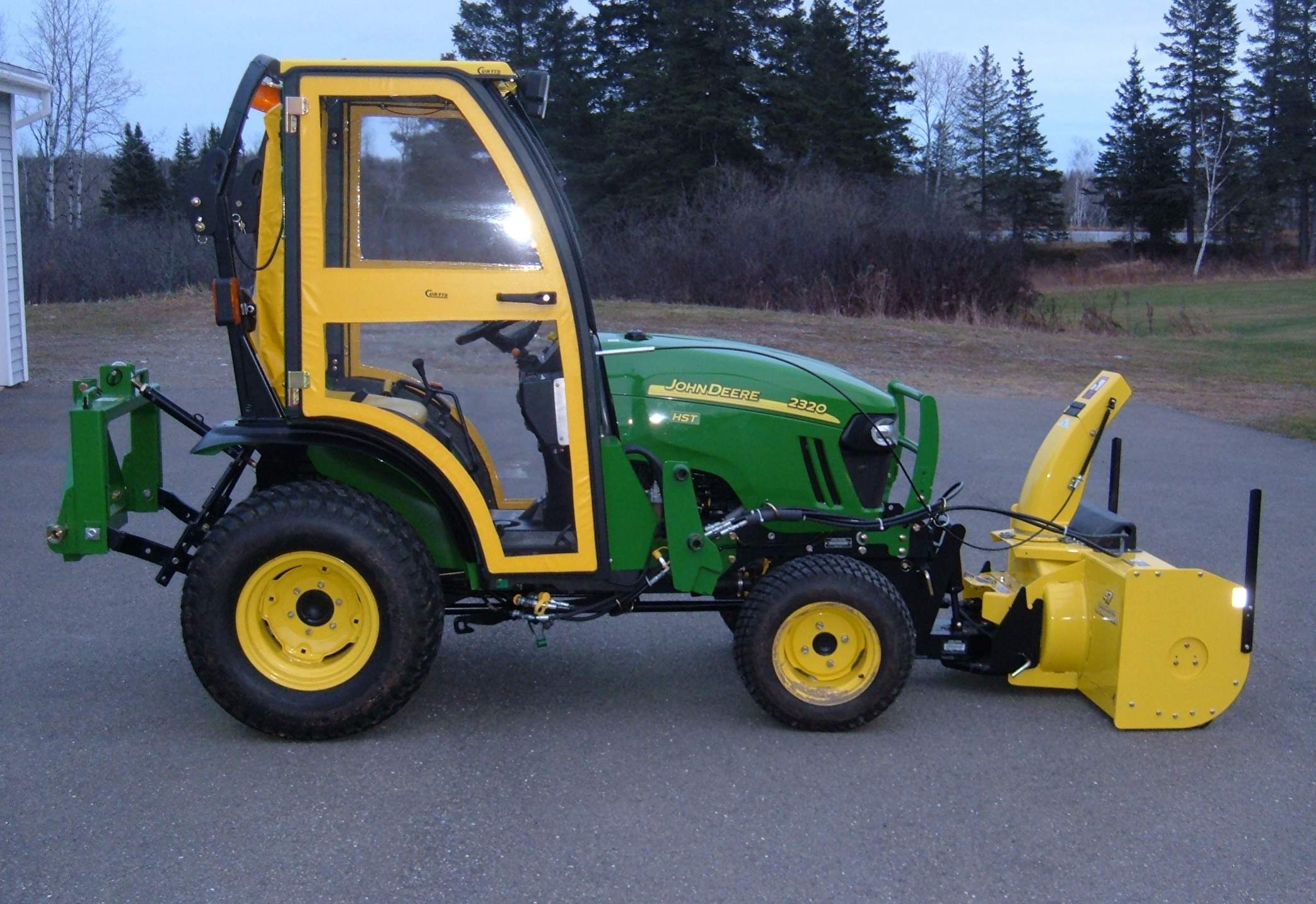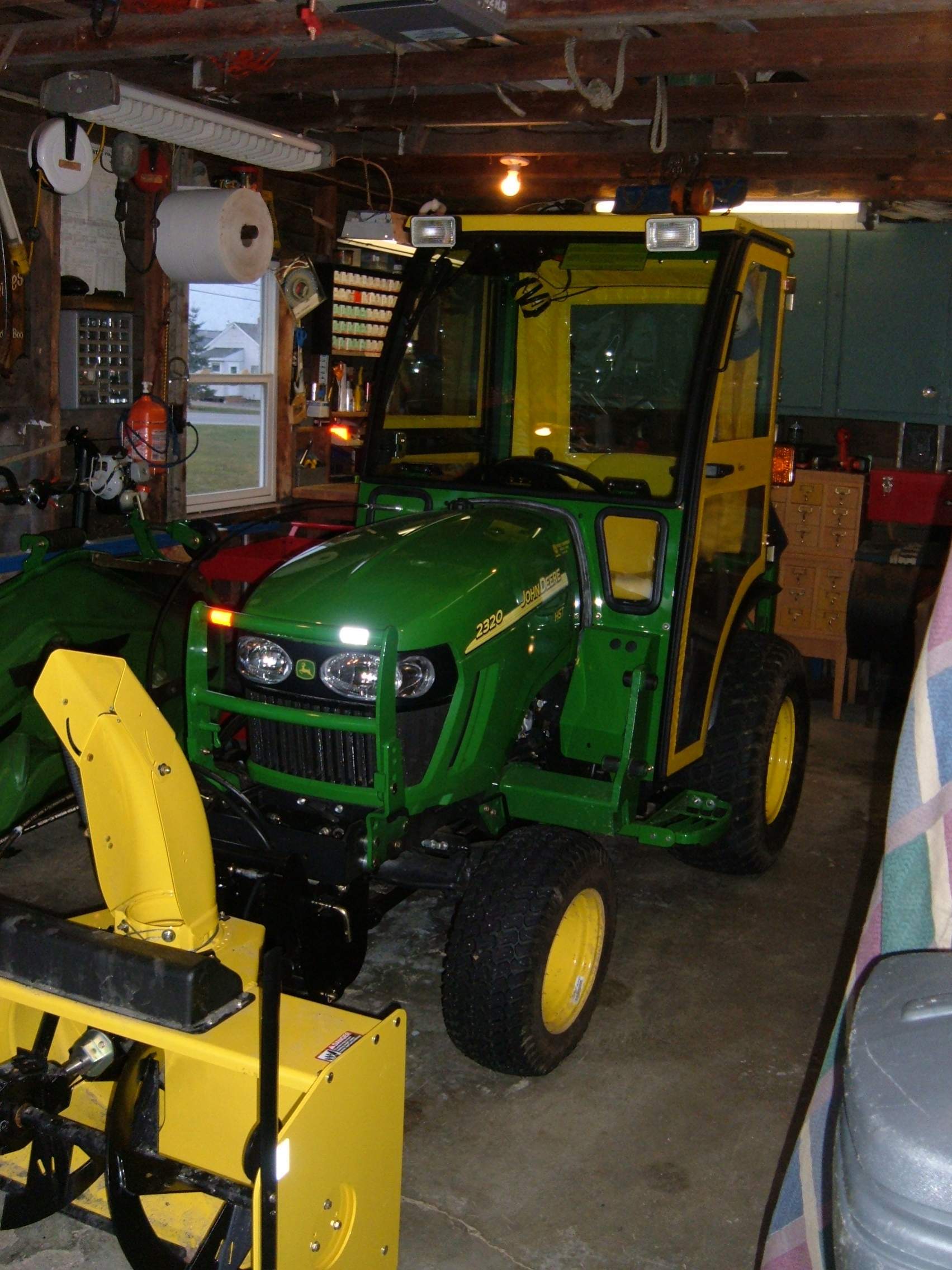 Scott, I just bought a Jd 2320 this summer and had the same questions. I now have a curtis soft sided cab on my tractor and love it. I have turf tires on mine and have a 9x7 garage door and my tractor is sitting in the garage as we speak. It all depends how your gargage door is framed (for the height opening) but I had lots of clearance. But you will have to fold down the ROPS bar. I did not want to mess around folding the bar up and down all the time. So I had a professional fabrication shop plasma cut the brackets off of the upper portion of the roll bar. I then cleaned up the brackets and reinstalled them on the tractor and put the upper portion of the roll bar back into the brackets so I could adjust the height of the roll bar. I adjusted it so that it stuck up 1" taller than my tractor cab. Therefore I had enough clearance to get into my gagage. I am a good welder, but I had the welding shop tig weld this all back together, they did a better job than John deere did! I then painted it with some Blitz Black I purchased at my local John Deere dealer. You wouldn't know it had ever been touched. I know that alot of people would say its taboo to shorten the rollbar, but what good is it if its always folded down. Tomorrow I will measure my total cab height if you want. If you would like I can take a few pictures too. But to answer your questions it does fit!!!!