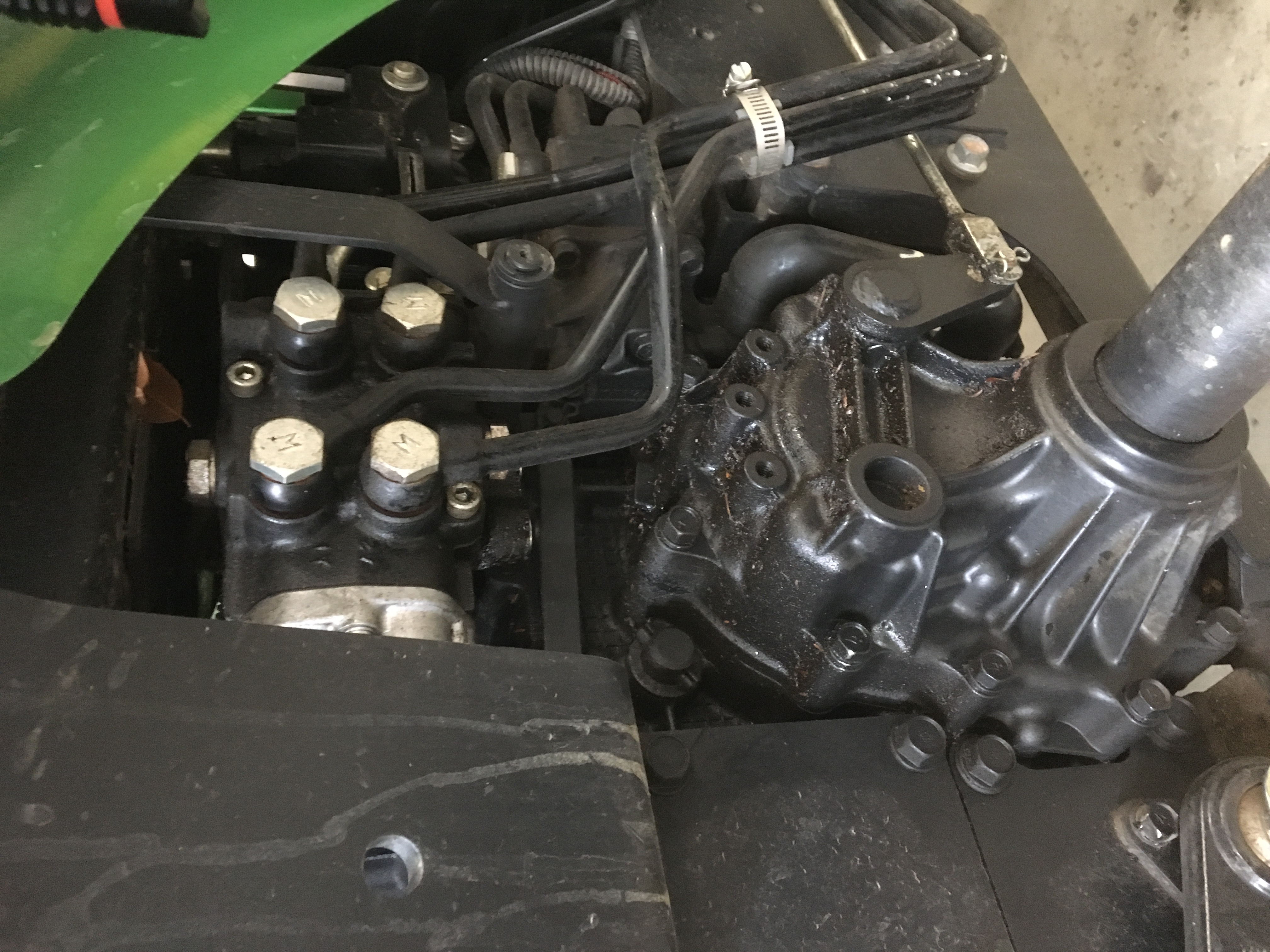 I noticed a small wet spot under the tractor yesterday (under right rear tire). After cleaning the area with a rag where the rear hydro connections are, it seems to be coming from the area in the photos - maybe a gasket failure?I want to tighten the bolts in the area (I doubt they are loose), but I need to take the hydro lines off to really get to them. I wanted to get your opinions before I dig into it.
