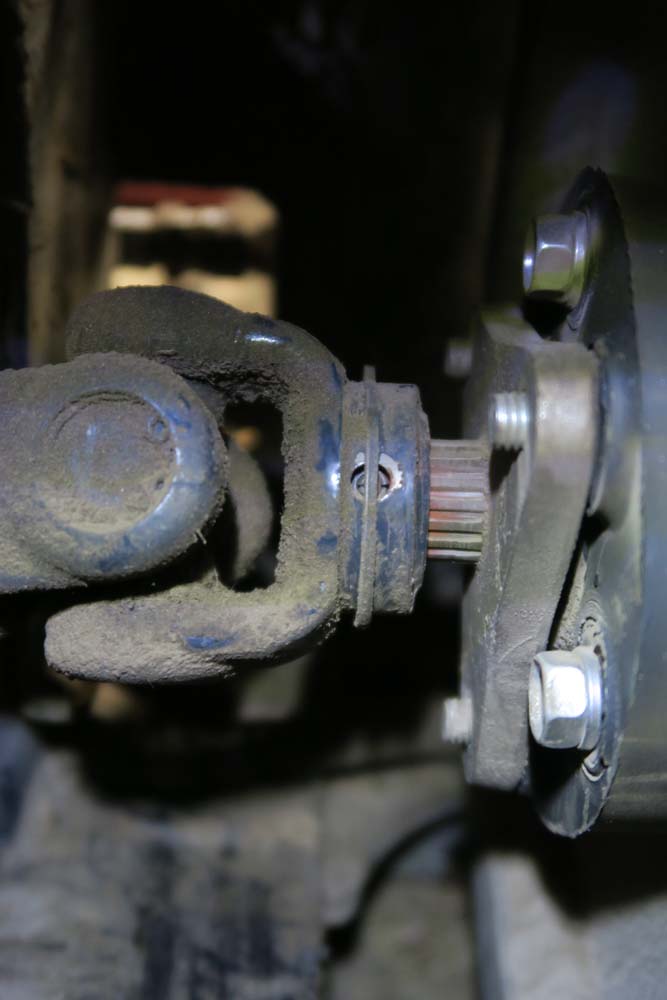 To remove the driveshaft you have to release the front yoke. It is pinned to the engine shaft and the pins are retained by a snap ring. The snap ring is massive. After breaking one set of snap ring plier ends, I got out the Dremel and cut the snap ring. I had anticipated some problem and got new snap rings and roll pins before starting this.