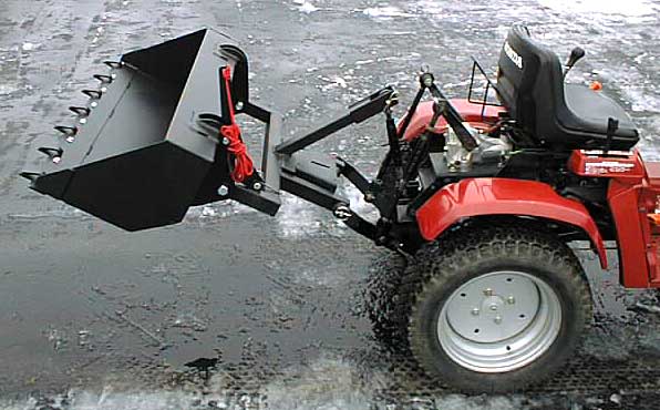 The bucket shown on the Honda tractor is really nice but just a glorified example of one, it even uses a rope trip mechanism if you look closely. I also guarantee that at that distance behind the tractor, a full load of sand or dense dirt would have the front end of the tractor off the ground when you lifted the bucket.
