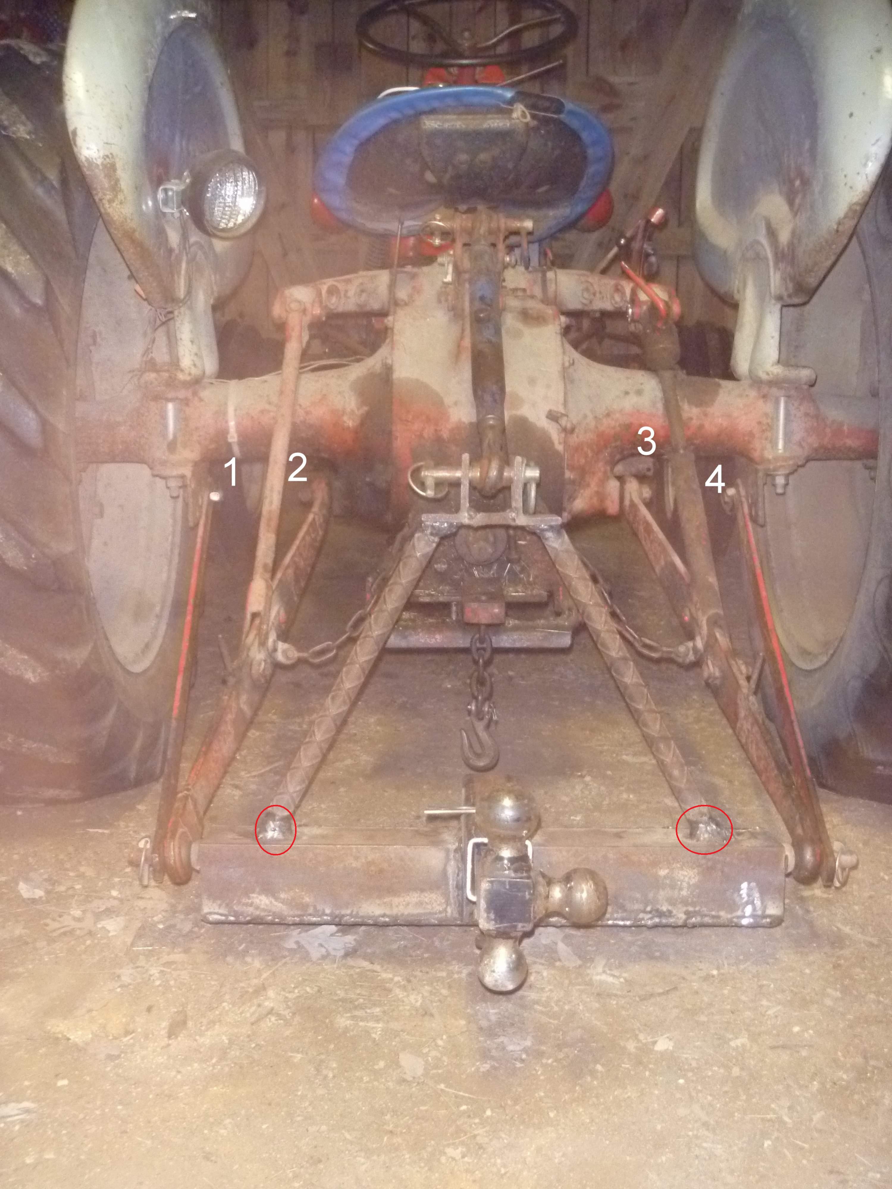 I had a difficult time writing an explanation. The short pins that I think may be bent/distorted are labeled 1,2,3,4 on the pic. where the arms attach to the tractor.